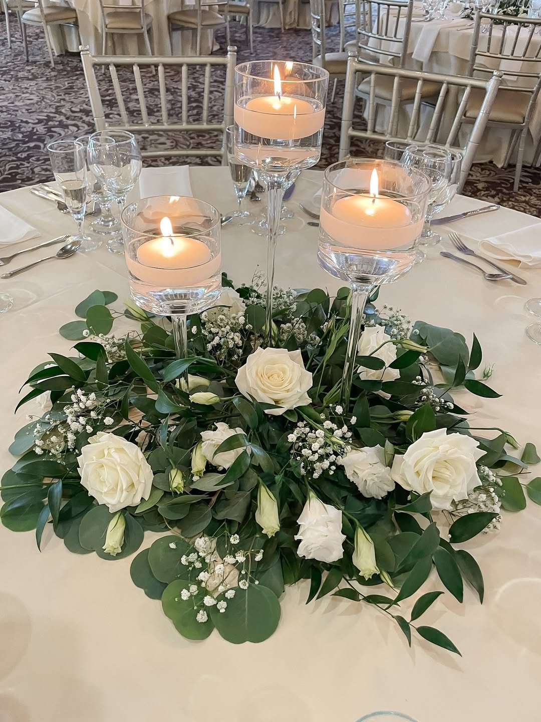 A wreath-style centerpiece always feels fresh. Here, white roses and baby’s breath are woven into lush eucalyptus, circling three elevated floating candles.
