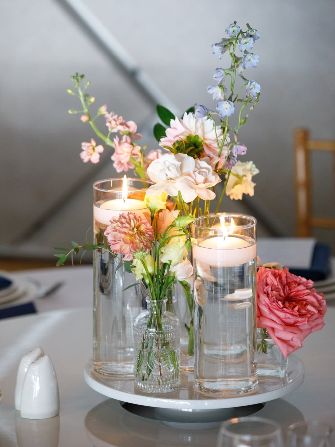 There’s something about soft candlelight dancing through glass cylinders that feels like the start of a love story. This centerpiece layers delicate pinks and airy blues with floating candles, creating a tablescape that feels intimate yet polished.