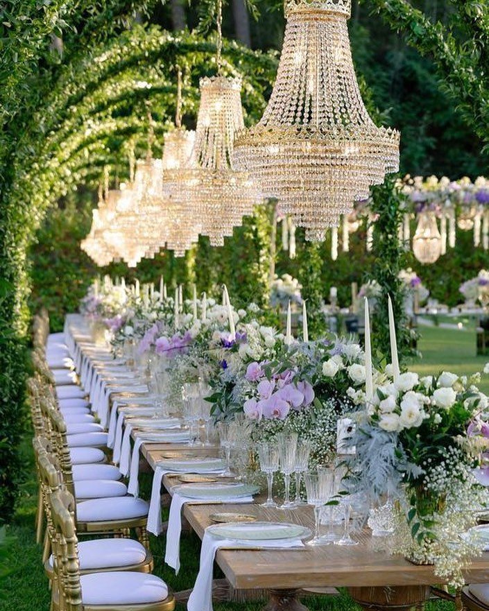 Dining beneath chandeliers woven through greenery feels like stepping into a secret garden after dusk. The mix of lavender, ivory, and soft greenery along those wooden tables adds texture without overwhelming the setting.
