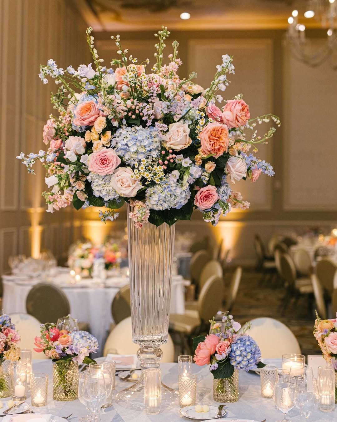 Now this is how you make an entrance. A towering crystal vase overflowing with hydrangeas, garden roses, and pastel blooms in peach and powder blue instantly transforms the room into something cinematic.