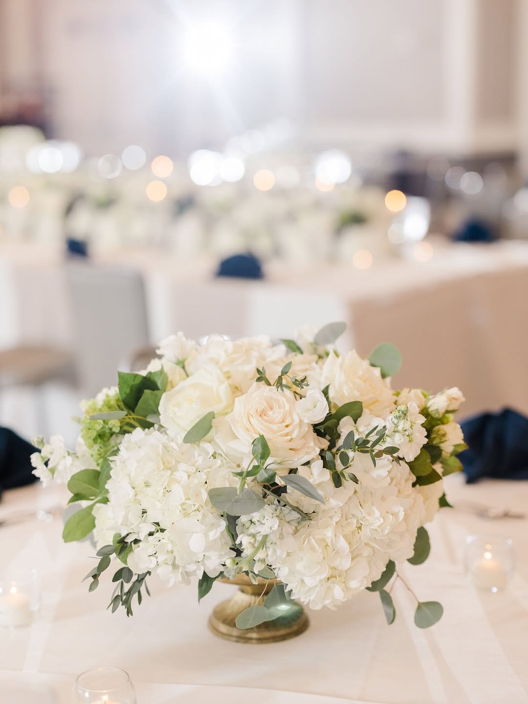 There’s something so calming about a lush mound of white hydrangeas and roses. It feels like a cloud resting gently at the center of the table, surrounded by soft linens and blurred candlelight.
