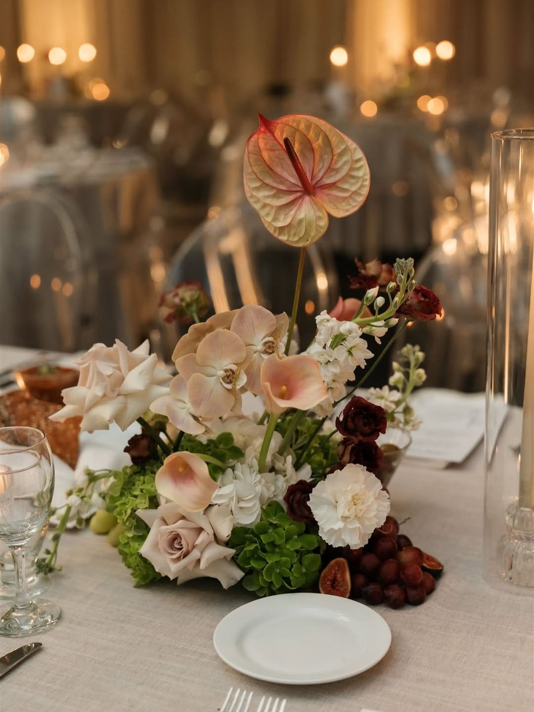 Now this is where things get a little editorial. Blush orchids, creamy roses, deep red blooms, and even fresh figs nestled into the arrangement create a tablescape that feels curated and thoughtful.
