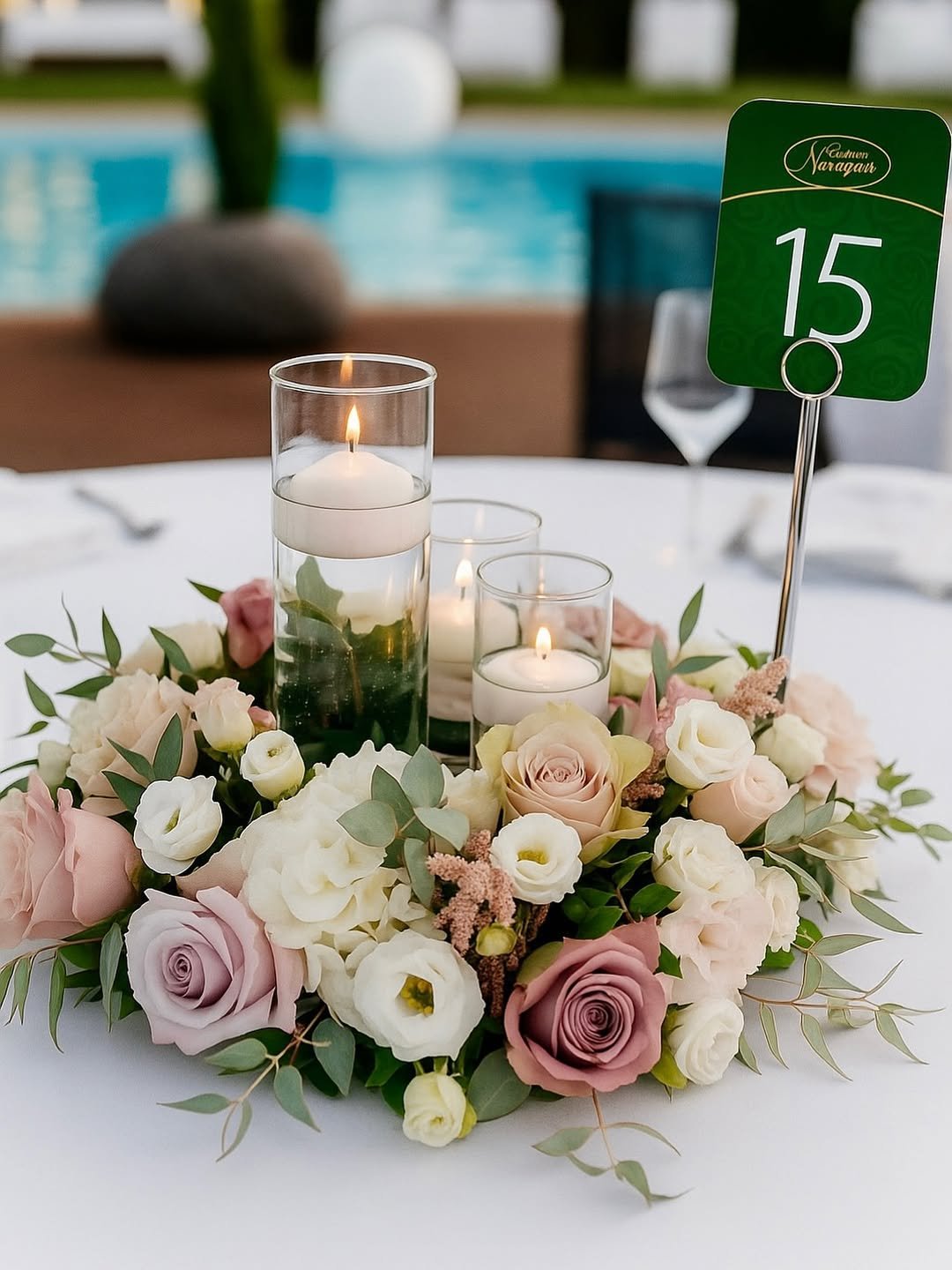 There’s something about blush roses and floating candles that feels like a summer evening bottled up and placed right at the center of the table. The soft pinks, creamy whites, and eucalyptus greens create that effortless romance, especially with the water shimmering in the background. It feels intimate but still elevated, like a destination wedding that never tries too hard.