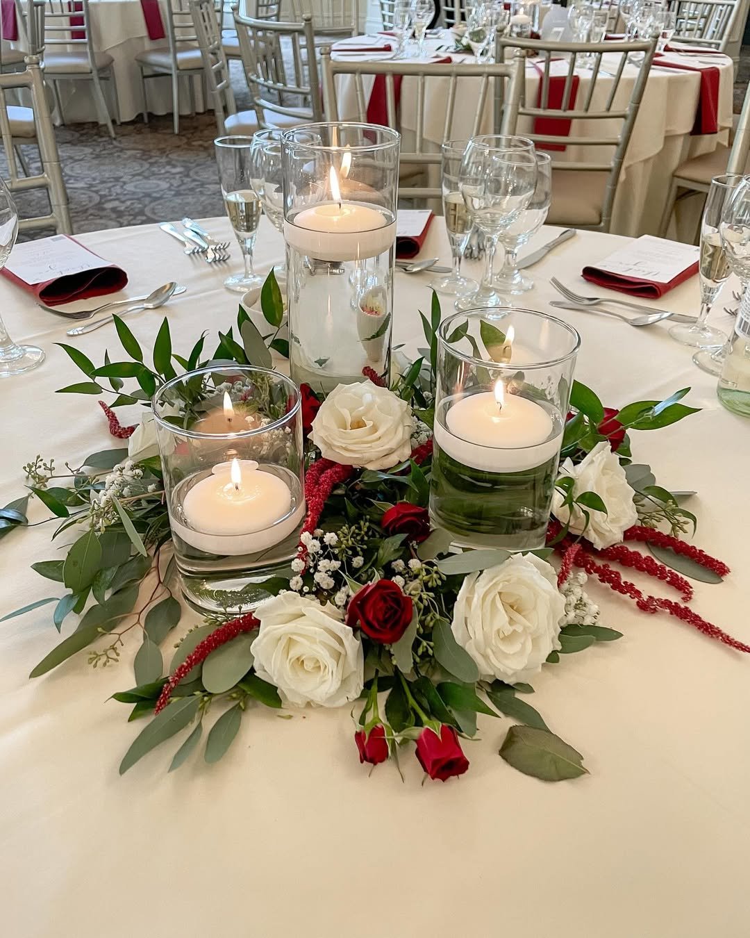 There’s something timeless about red roses paired with crisp white blooms. Add in floating candles and layered greenery, and suddenly the whole table feels warm and celebratory.