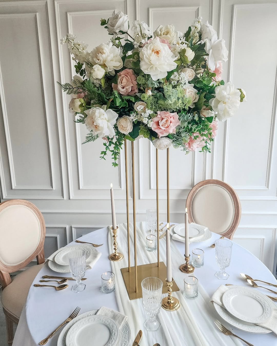 Tall gold stands topped with lush blooms always feel regal, especially against classic paneled walls and ivory table settings. The blush and cream florals spill outward in a way that feels abundant yet balanced.