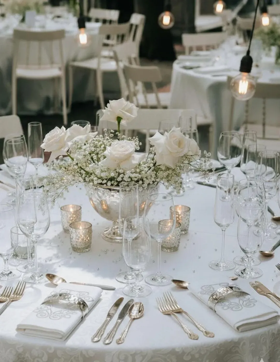 This design feels like a quiet nod to old-world elegance. A silver compote filled with white roses and baby’s breath brings a softness that pairs beautifully with crystal glassware and glowing votives.