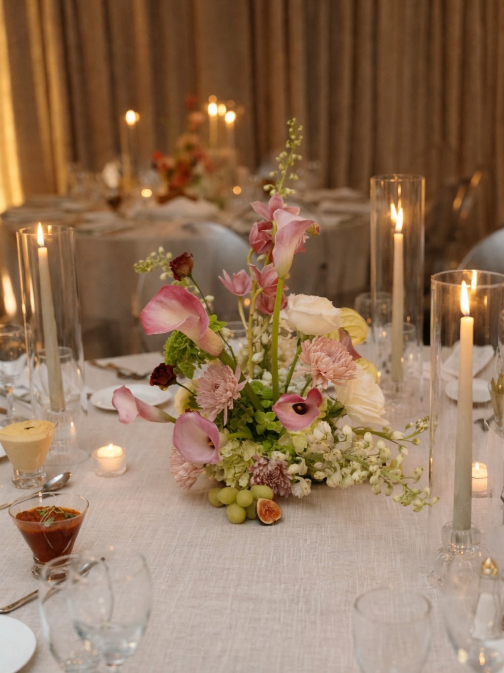 Pink calla lilies and blush roses framed by tall glass candles? Yes, please. This arrangement feels intimate and feminine without tipping into overly sweet territory.