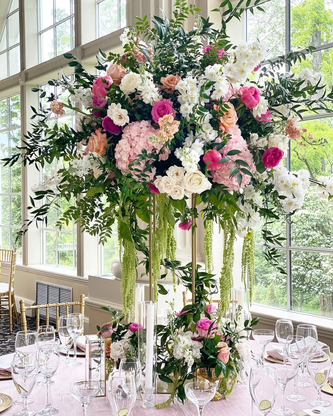 This design feels like a secret garden climbing toward the ceiling. Pink peonies, hydrangeas, white roses, and cascading amaranthus spill from a tall gold stand, creating layers of texture and movement that feel lush and celebratory.