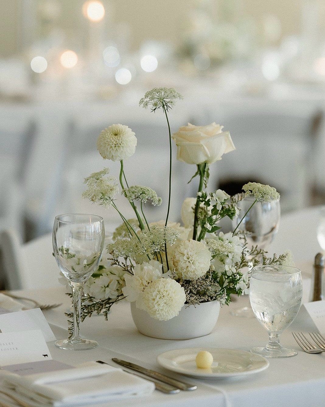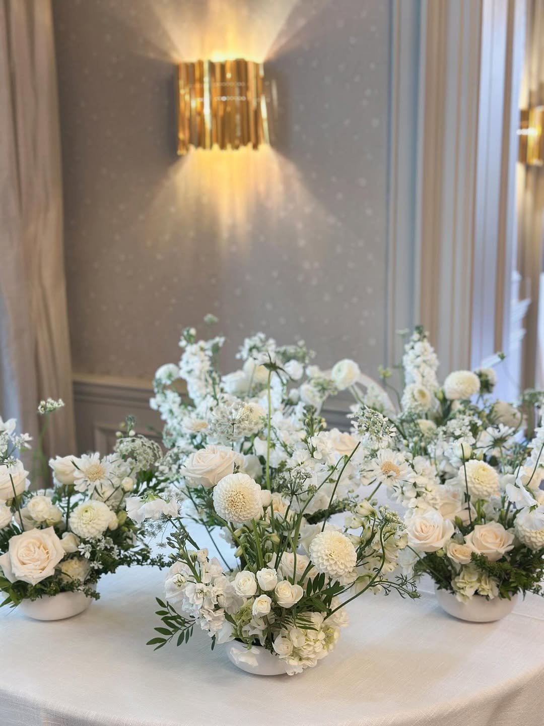 Imagine walking into a room filled with clusters of white florals in low bowls, each one slightly different. It feels organic, almost like a garden brought indoors.