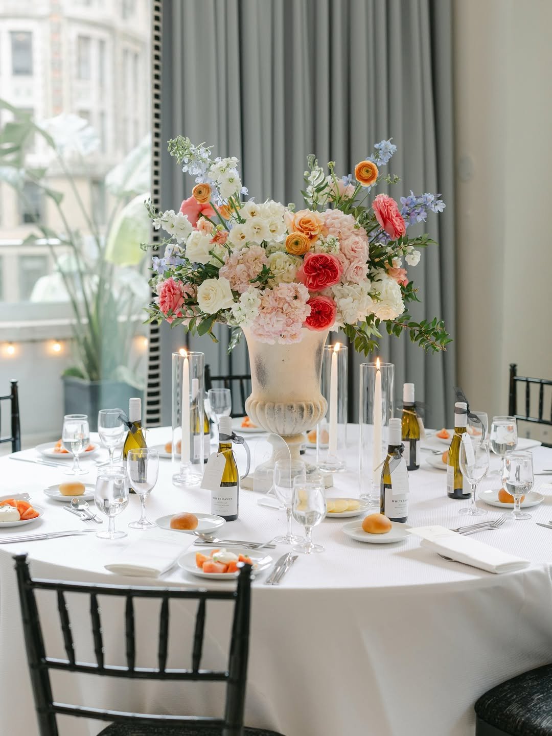 A stone urn overflowing with roses, ranunculus, and soft hydrangeas instantly gives old-world charm. Set against tall windows and glowing taper candles, the arrangement feels stately yet inviting.