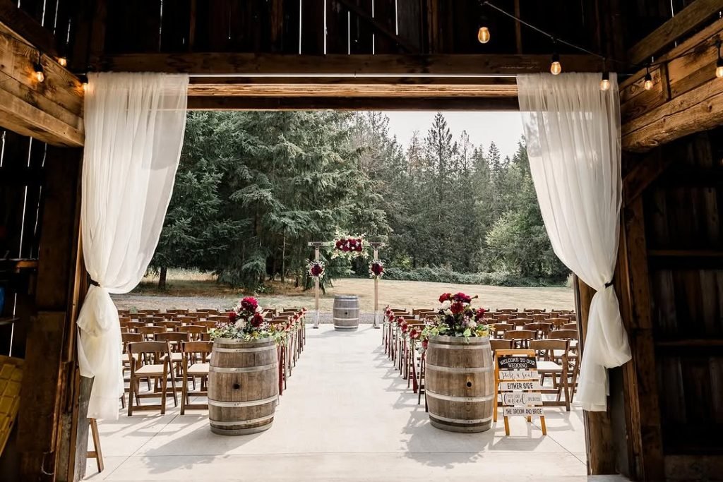 This rustic-meets-elegant setup opened straight into the pines—with a cozy barn framing the aisle, soft draping, and rich wine-toned florals stealing the show.