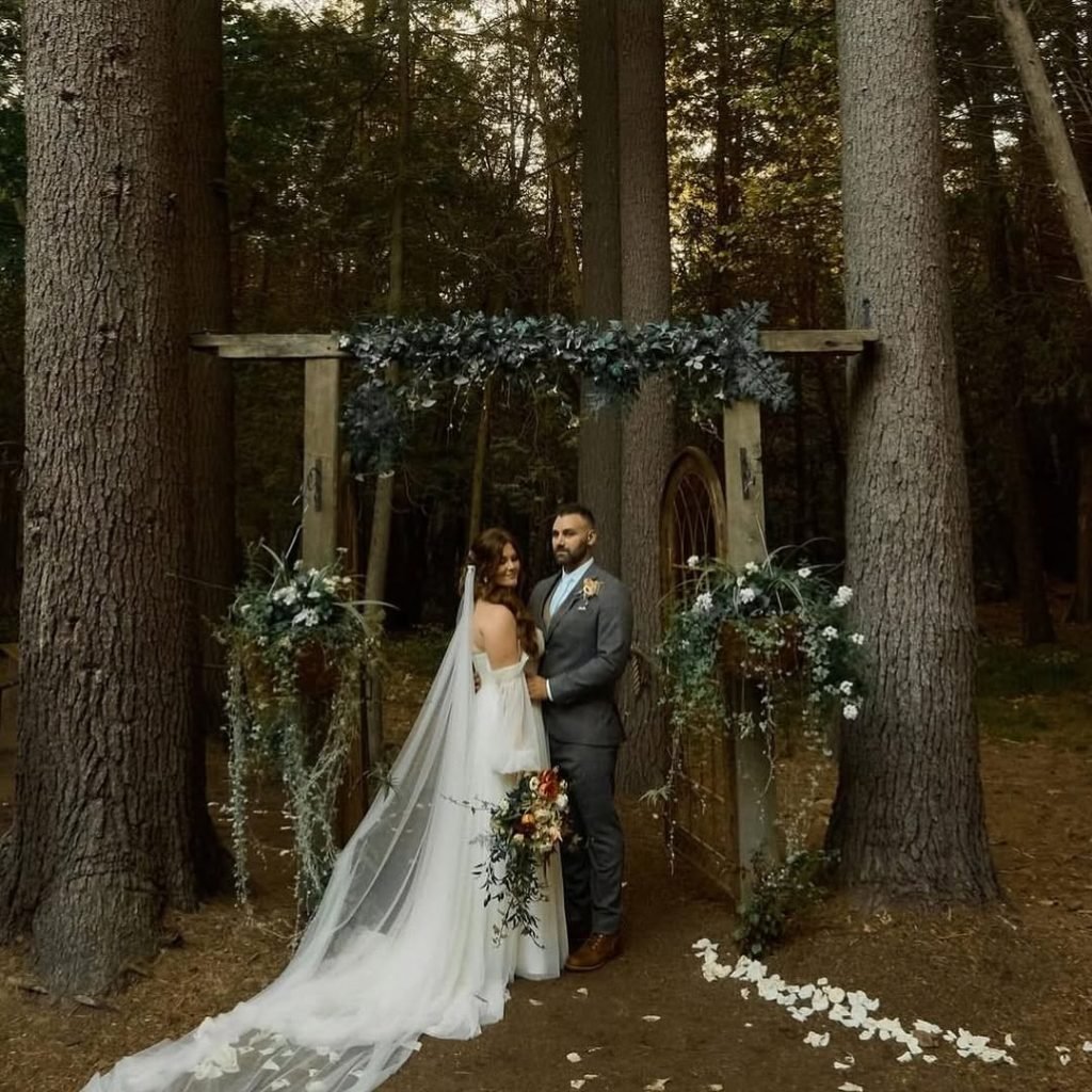 Tucked into nature’s embrace, soft white florals and a blooming arch completed the scene. It’s the kind of place where vows feel sacred and the forest leans in to listen.