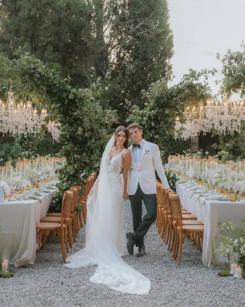 The bride’s lace gown and the groom’s crisp white jacket felt perfectly polished amid the lush setting. An effortlessly chic celebration made for golden hour magic.