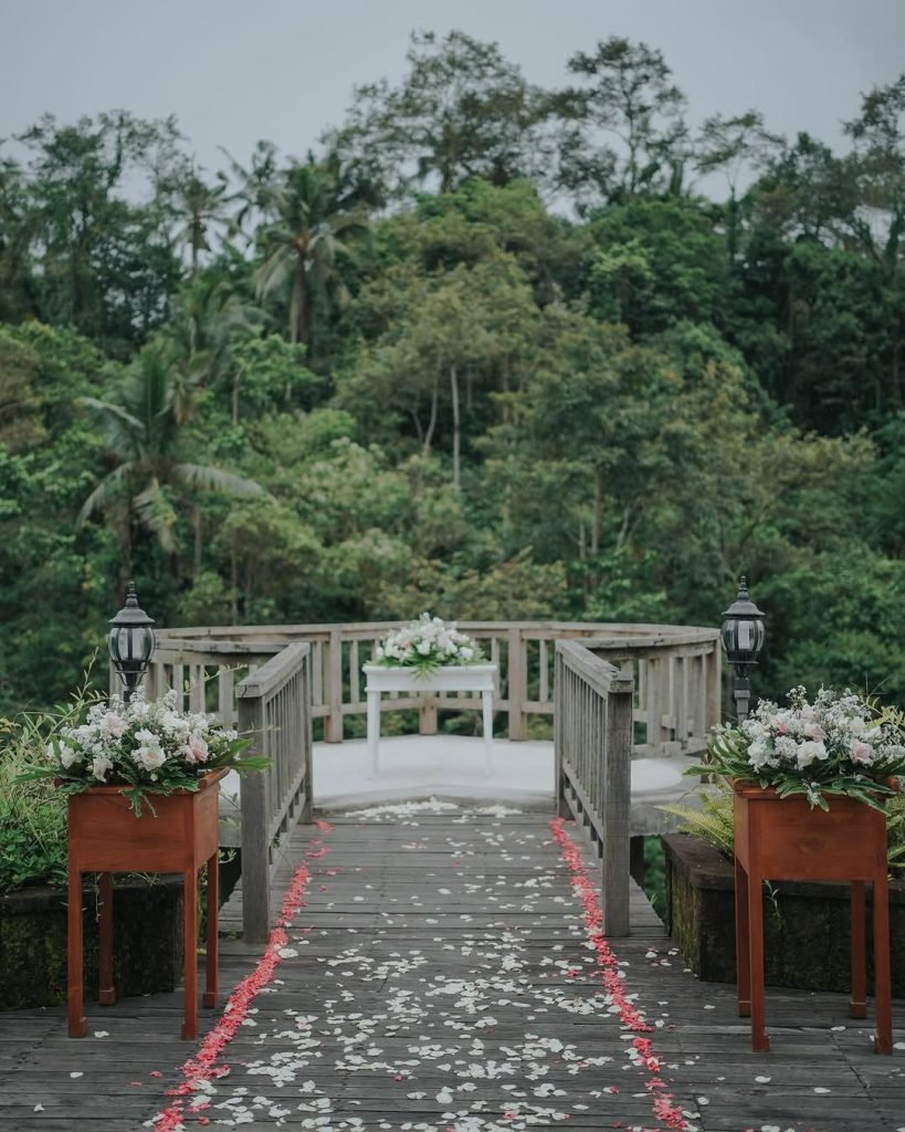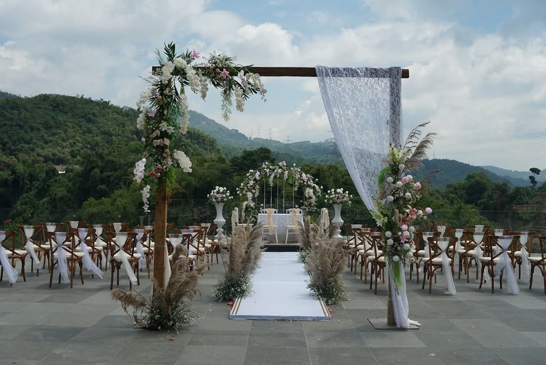 Tucked into the lush hills, Forest Hills Hotel Ciwidey brought this dreamy terrace to life with a breezy lace-draped arbor, soft pampas accents, and a view that honestly deserves its own RSVP. It’s airy, it’s cinematic, and it makes “forever” feel like the easiest yes in the world.
