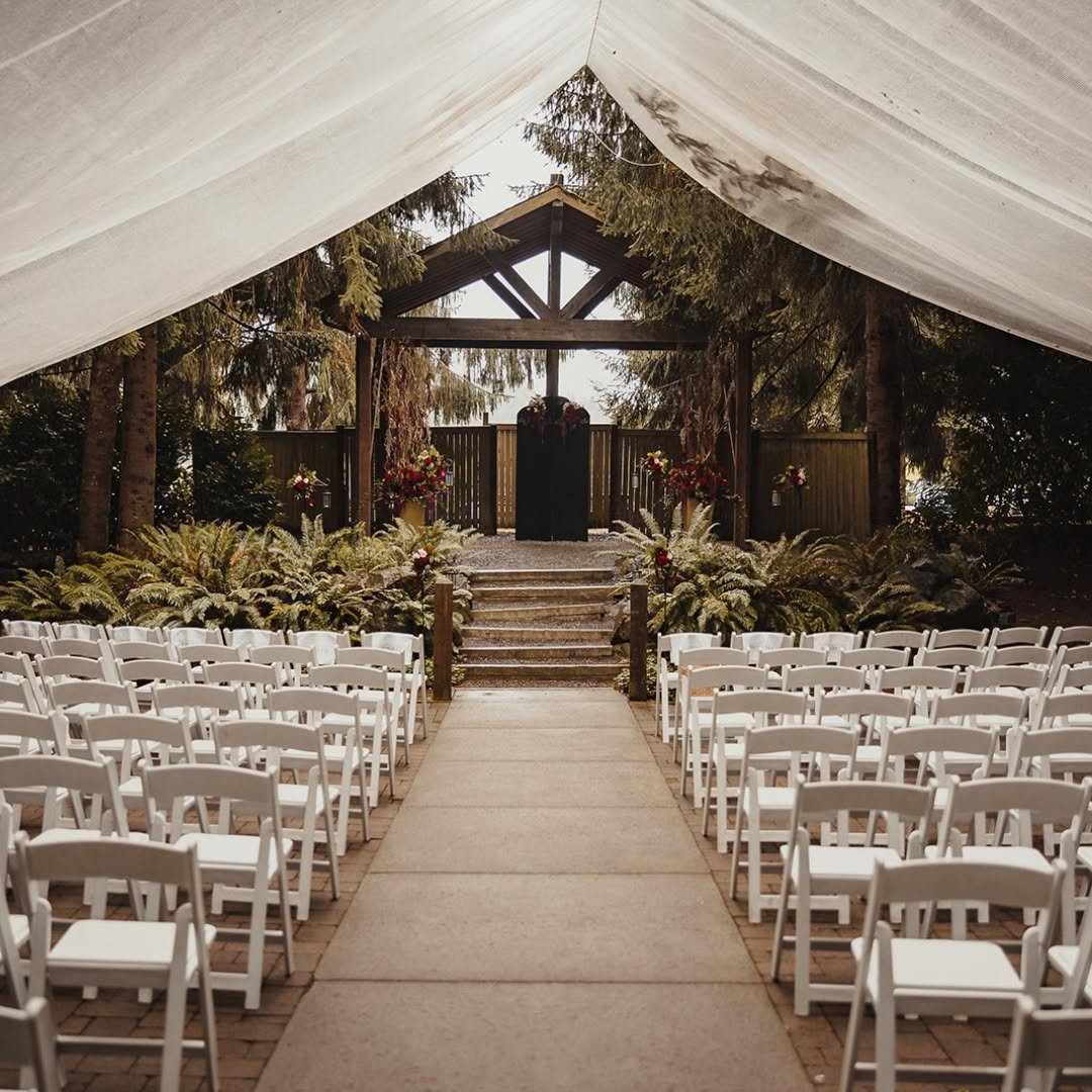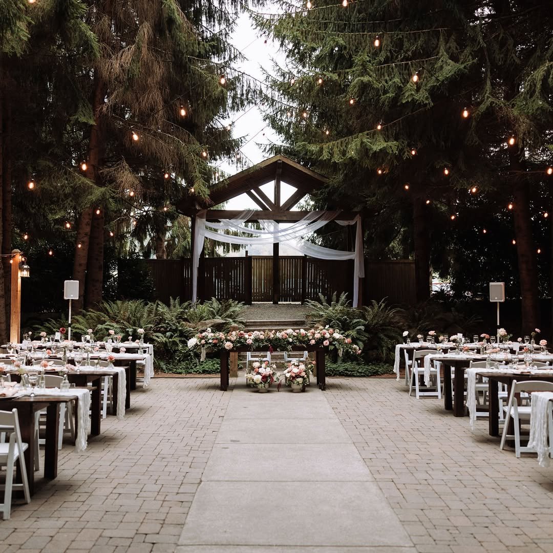 With a simple white arbor wrapped in soft blooms and rows of crisp chairs ready for guests to swoon, this forest-side venue at Ridgefield Weddings nails that perfect balance of polished and wild. It’s the kind of ceremony space where the sun just has to show up fashionably late — glowing, of course.