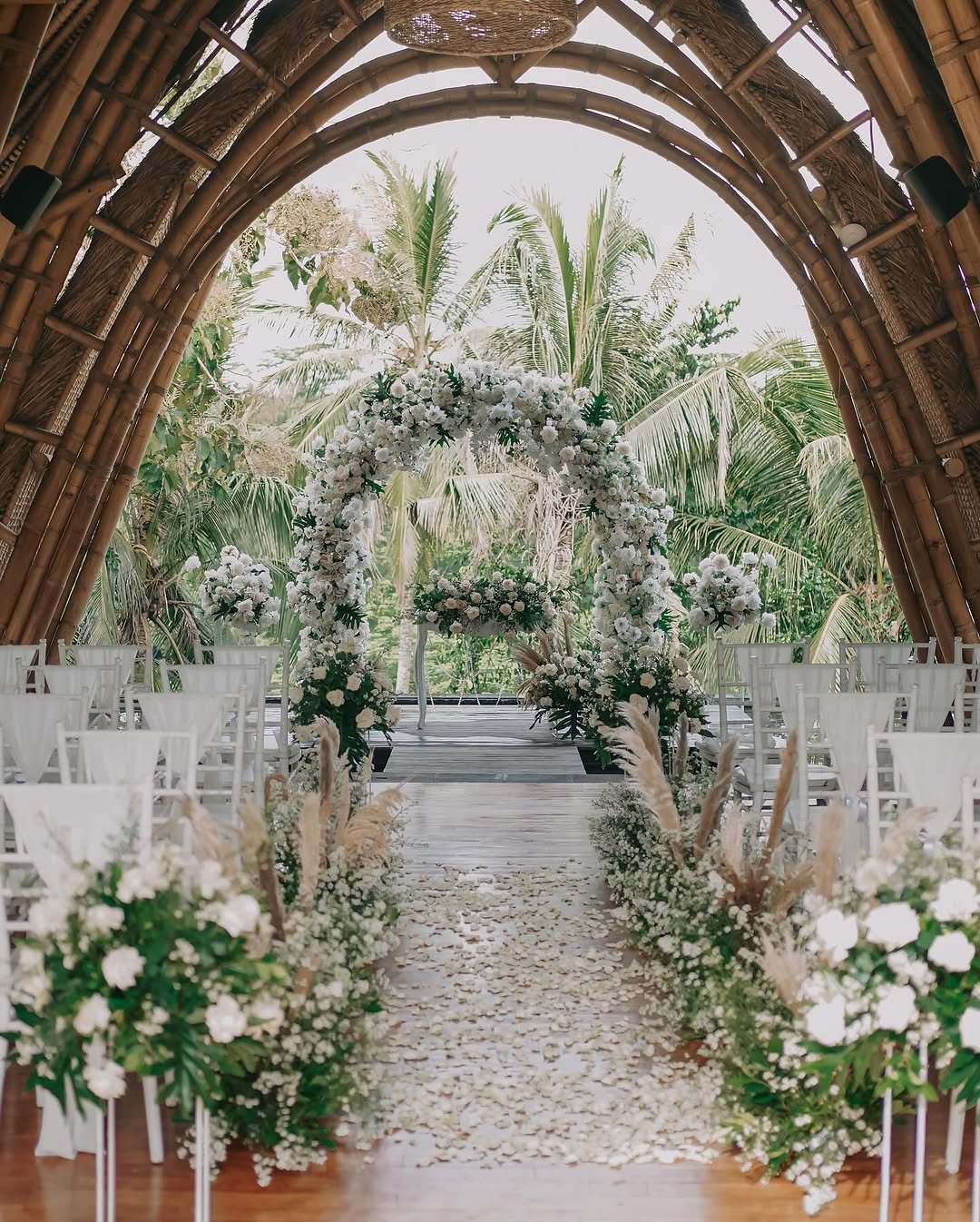 Kenran Resort by soscomma created a breathtaking forest altar wrapped in soft white blooms, wild greenery, and the dreamiest bamboo architecture overhead. It’s lush, it’s serene, and it basically feels like Mother Nature RSVP’d “absolutely, I’ll bring my best vibes.” Honestly, I’d get married twice just for an excuse to walk down that petal-strewn aisle.