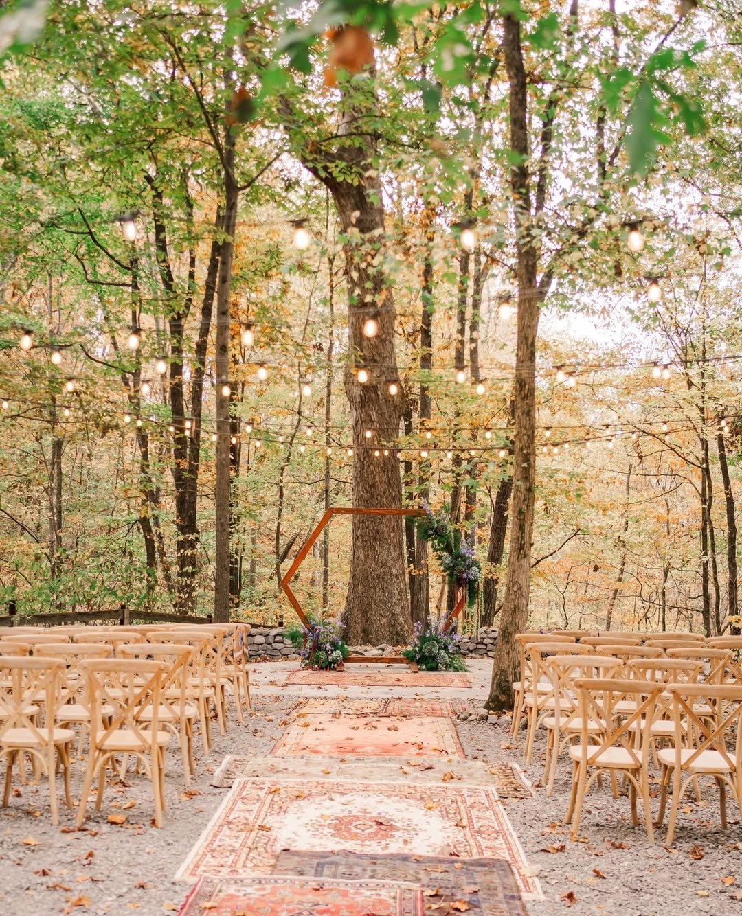 Tucked into a cozy forest clearing, this dreamy setup layers earthy magic with an eclectic rug runway and a modern wooden arch framed by wild blooms. Oakleaf Cottage, a sustainable wedding venue, proves you don’t need four walls when you have 400 trees and a string of fairy lights — it’s rustic, relaxed, and just the right amount of enchanted forest realness.