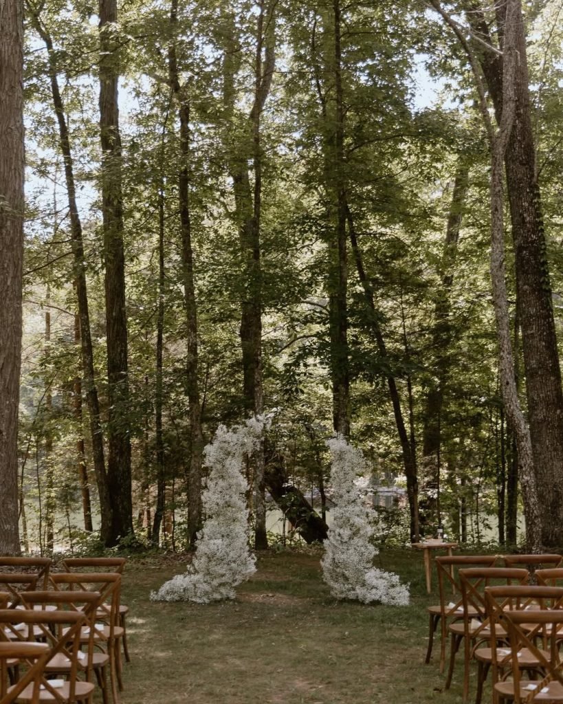 With wooden chairs tucked into the clearing and sunlight filtering through the leaves, it felt like a secret garden where vows could echo through the trees.