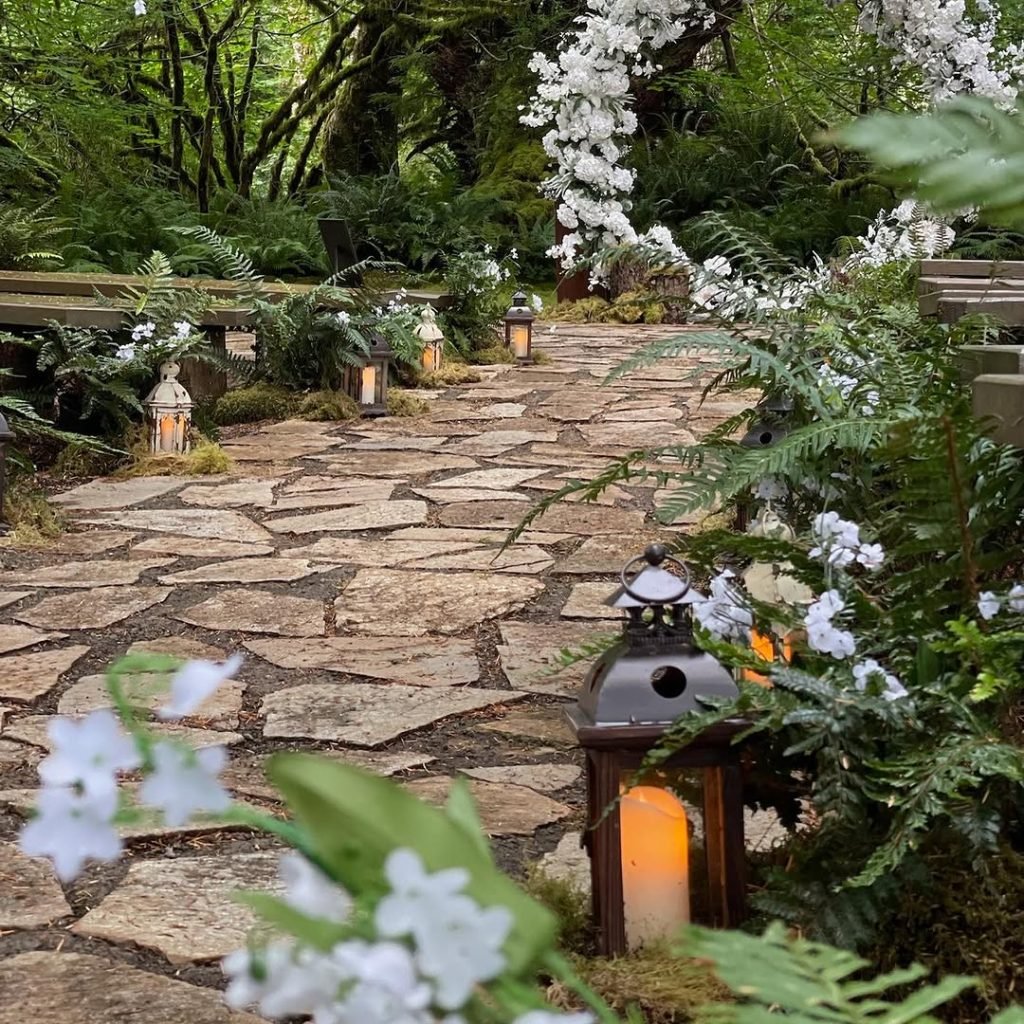 This mossy forest aisle felt straight out of a dream—stone path winding under canopies of green, flickering lanterns lighting the way. Every step toward the altar was quiet and magical.