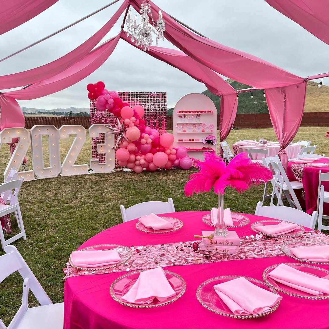 Okay, this one is the definition of “extra” in the best possible way. A pink tent, a chandelier, sequin runners, and a sea of rosy balloons? It’s like if Barbie threw a grad bash in the Hamptons.