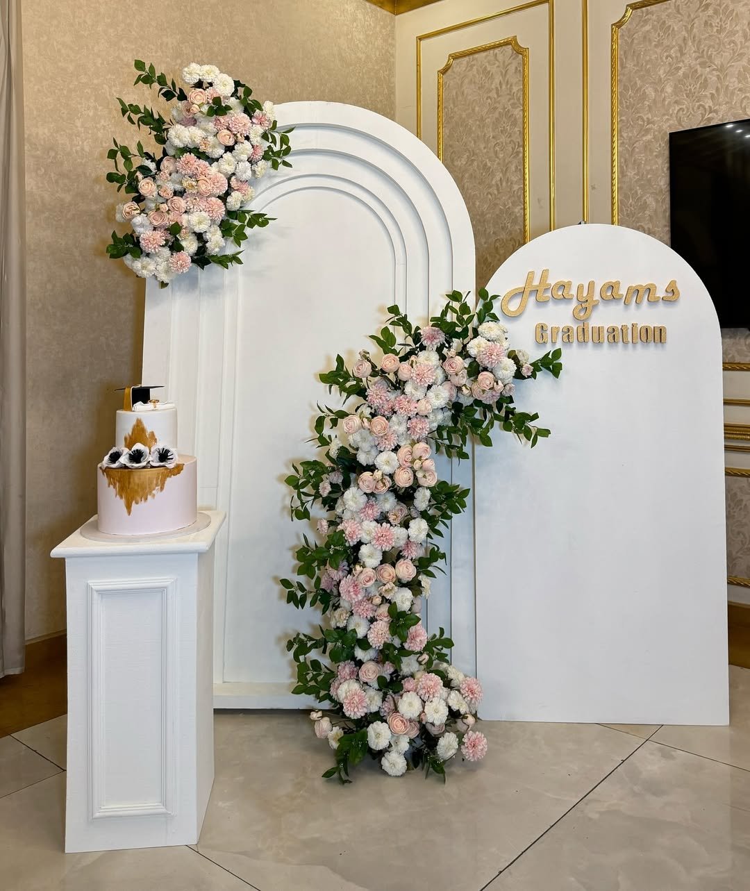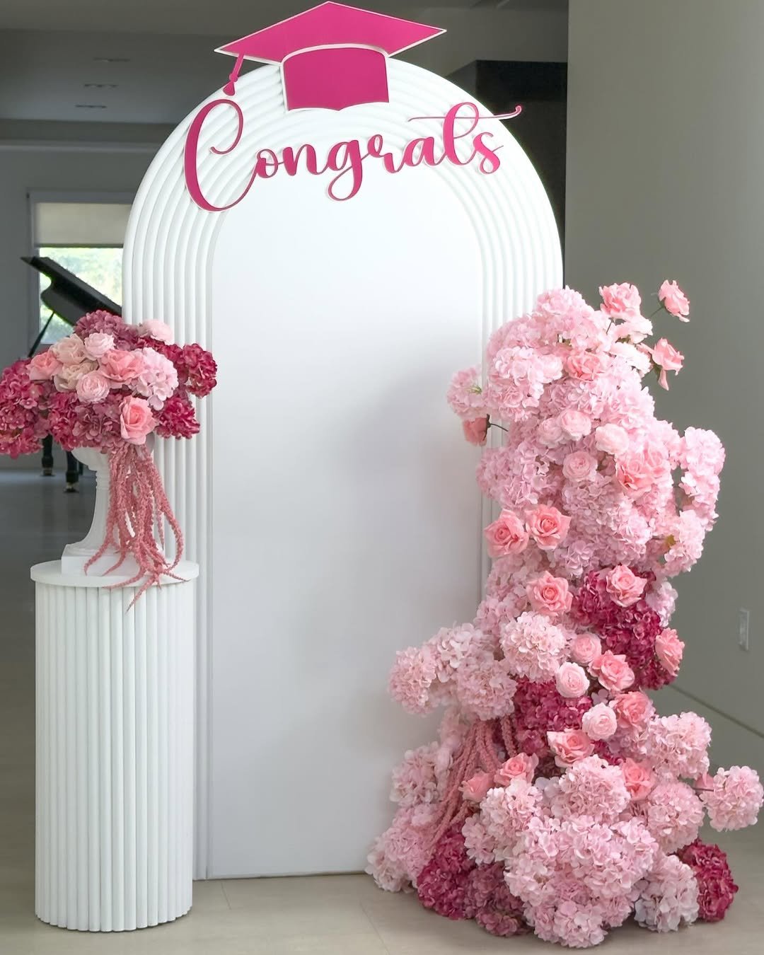 What happens when a graduation party gets the full floral fantasy treatment? You get @decocraftbyroy_halifax’s perfectly pink dream. An elegant arched frame, modern pedestals, and a wall of rosy blooms cascading like a waterfall—this backdrop is feminine, fierce, and completely photo-ready.