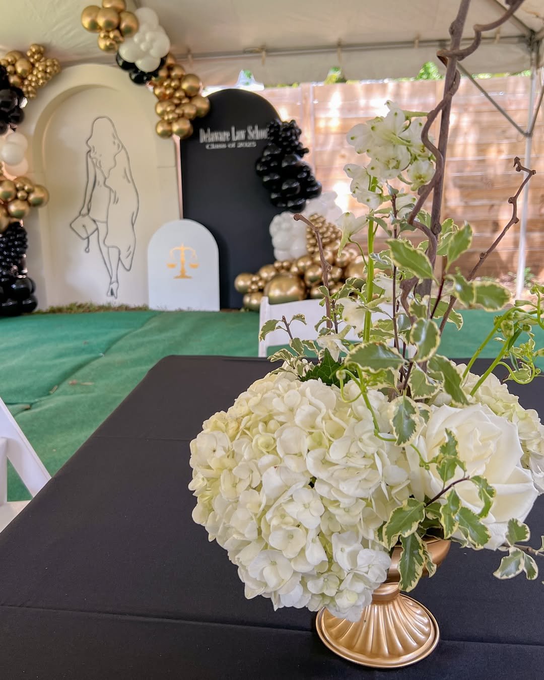 Black, gold, and white done right—this law school celebration goes all in on drama. The silhouette cutout adds major personality, and those metallic balloons shimmer like eveningwear under a tented sky.