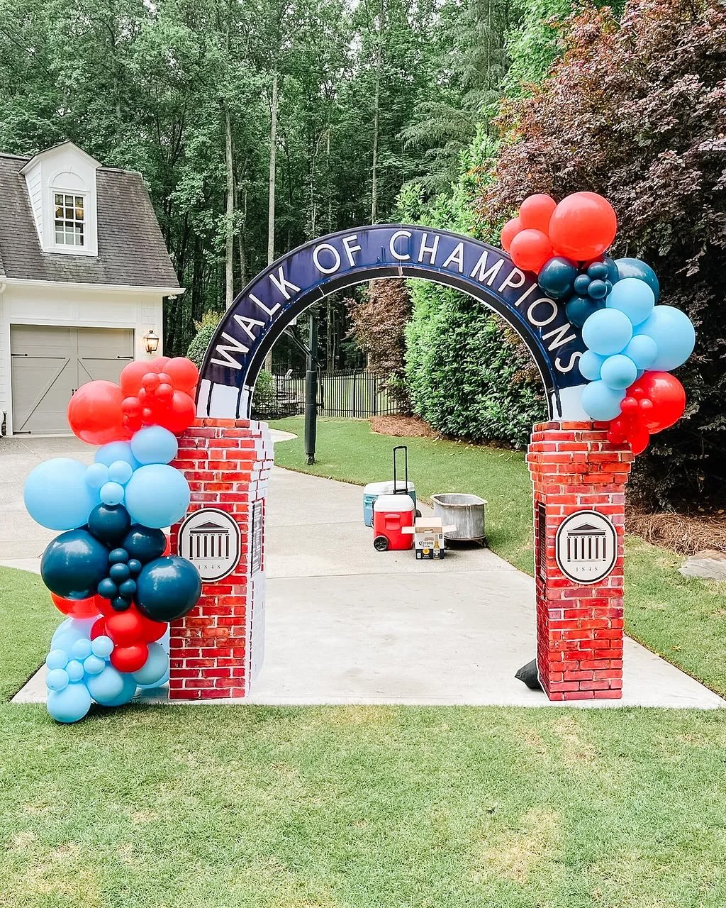 This setup hits that nostalgic sweet spot—red, white, and blue never looked this cool. The brick pillars and arched sign scream “school pride,” and those balloon clusters give major pep rally energy.