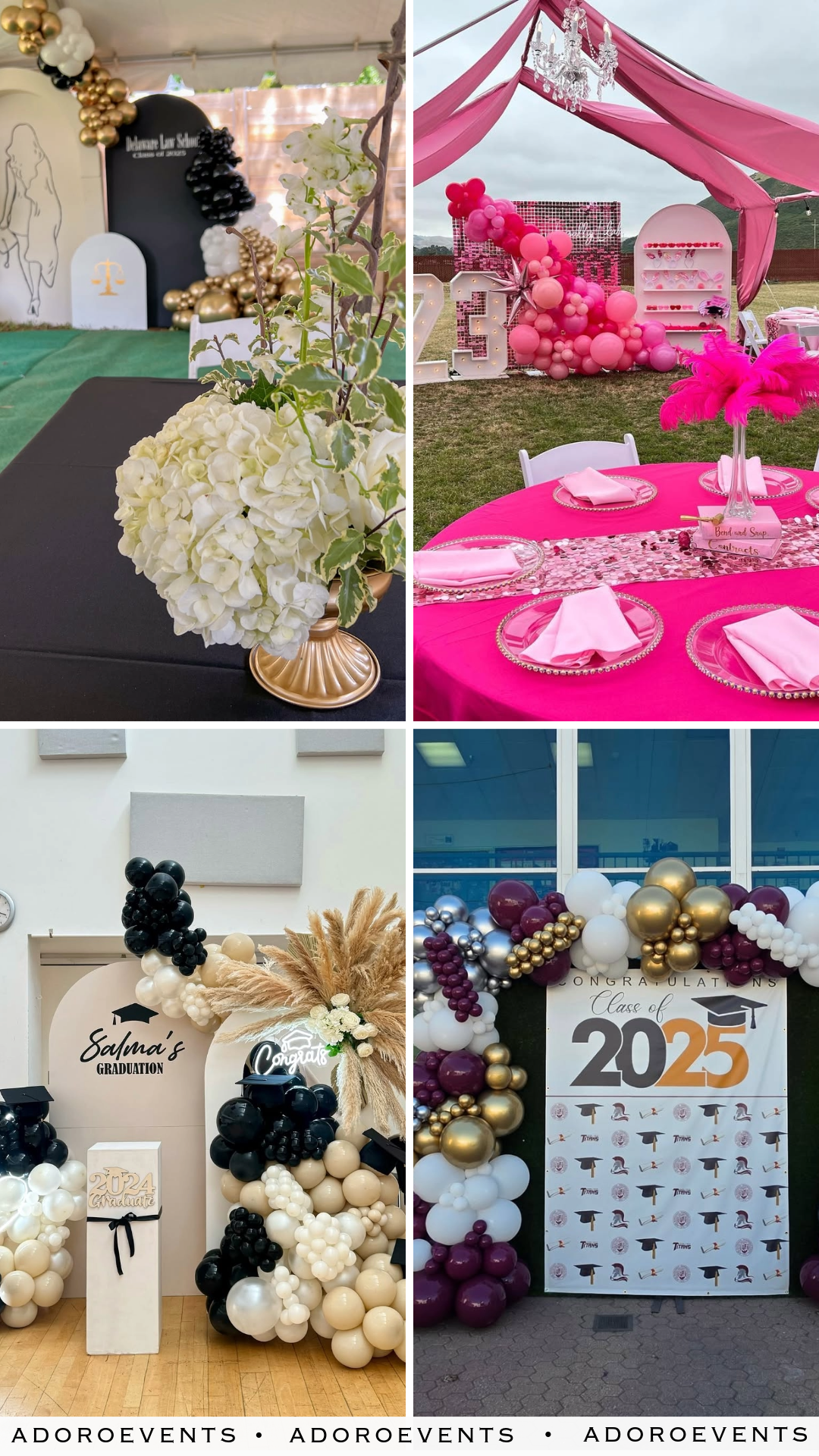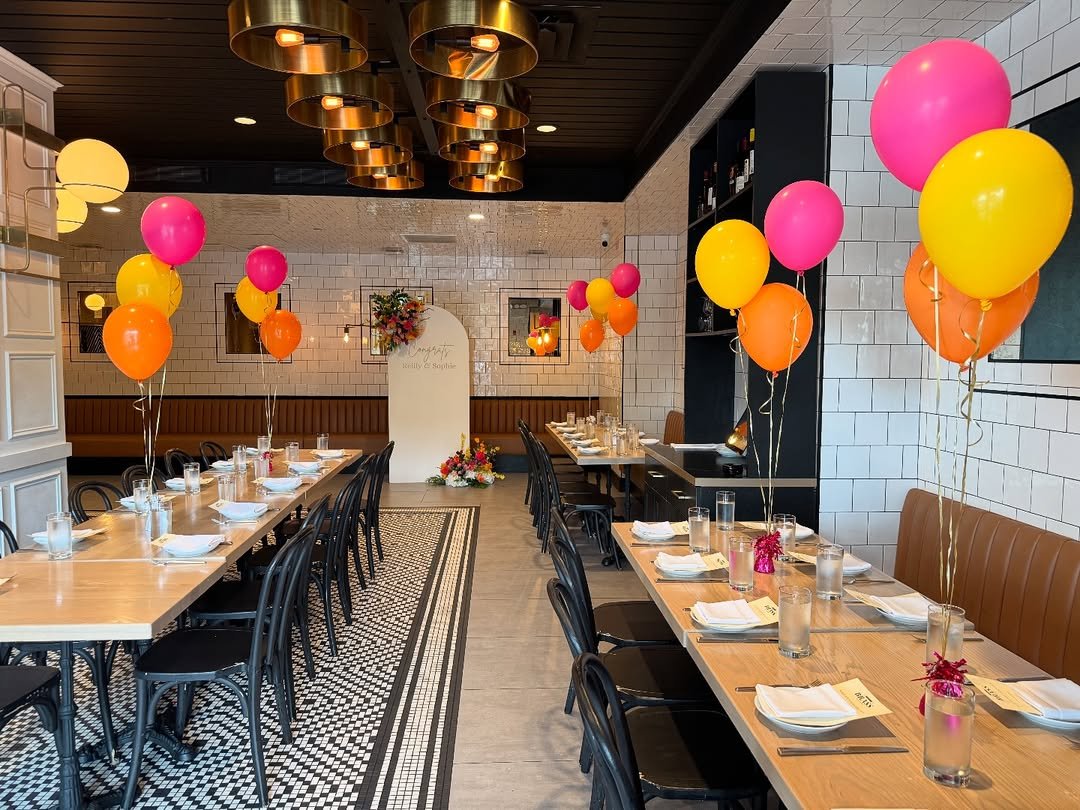 Fresh, funky, and totally fun—this restaurant setup leans into the playful side of grad season. Bright pink, orange, and yellow balloons line the tables like little bursts of joy, while the floral focal point up front adds a splash of elegance.