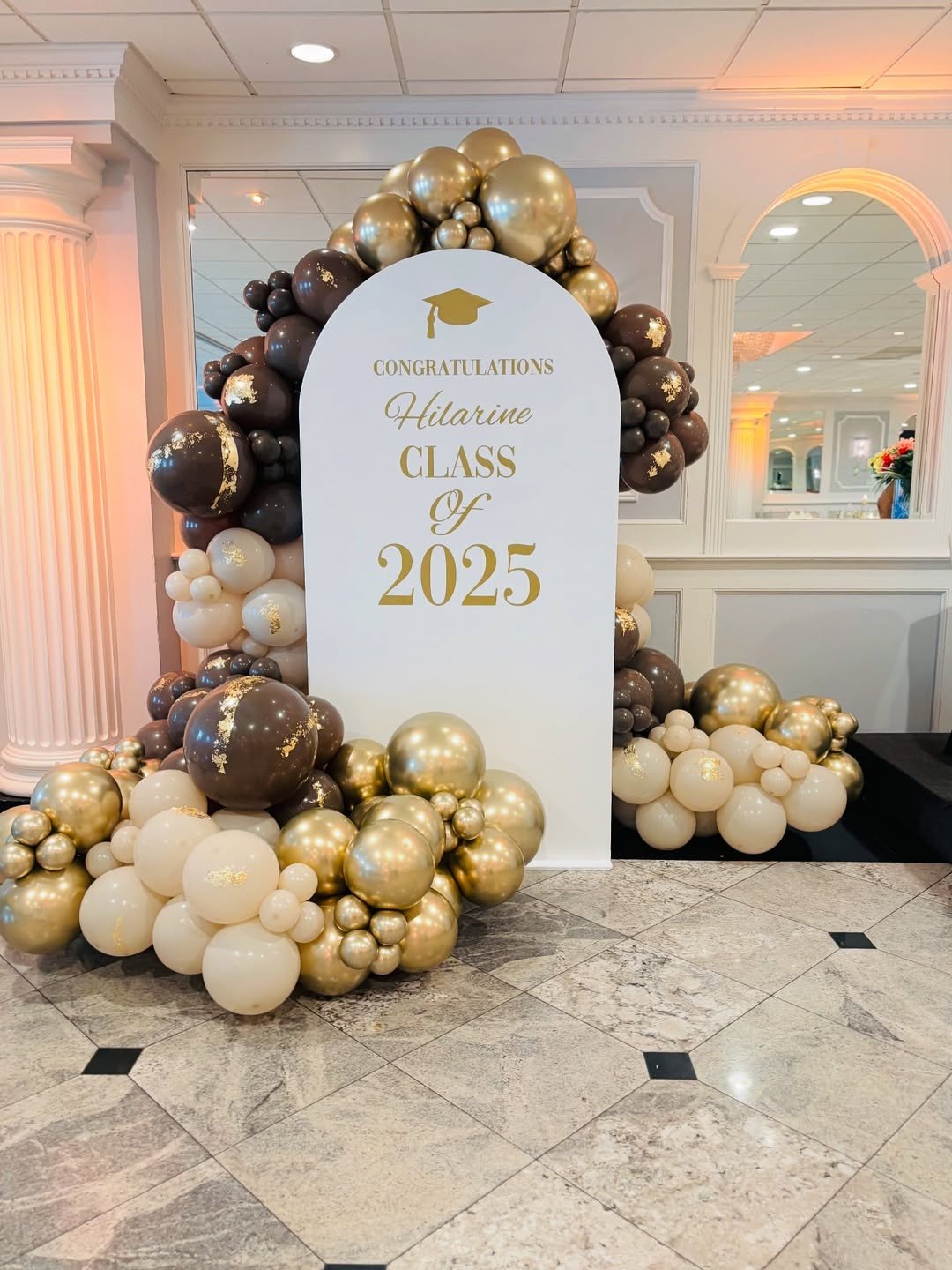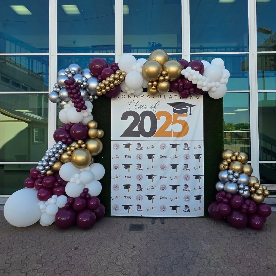 If you want to bring the whole class into the spotlight, @beckysballoonart has the perfect fix. Burgundy, gold, and white balloons frame a branded school-themed banner in the most festive way—ideal for group photos or a class-wide celebration.