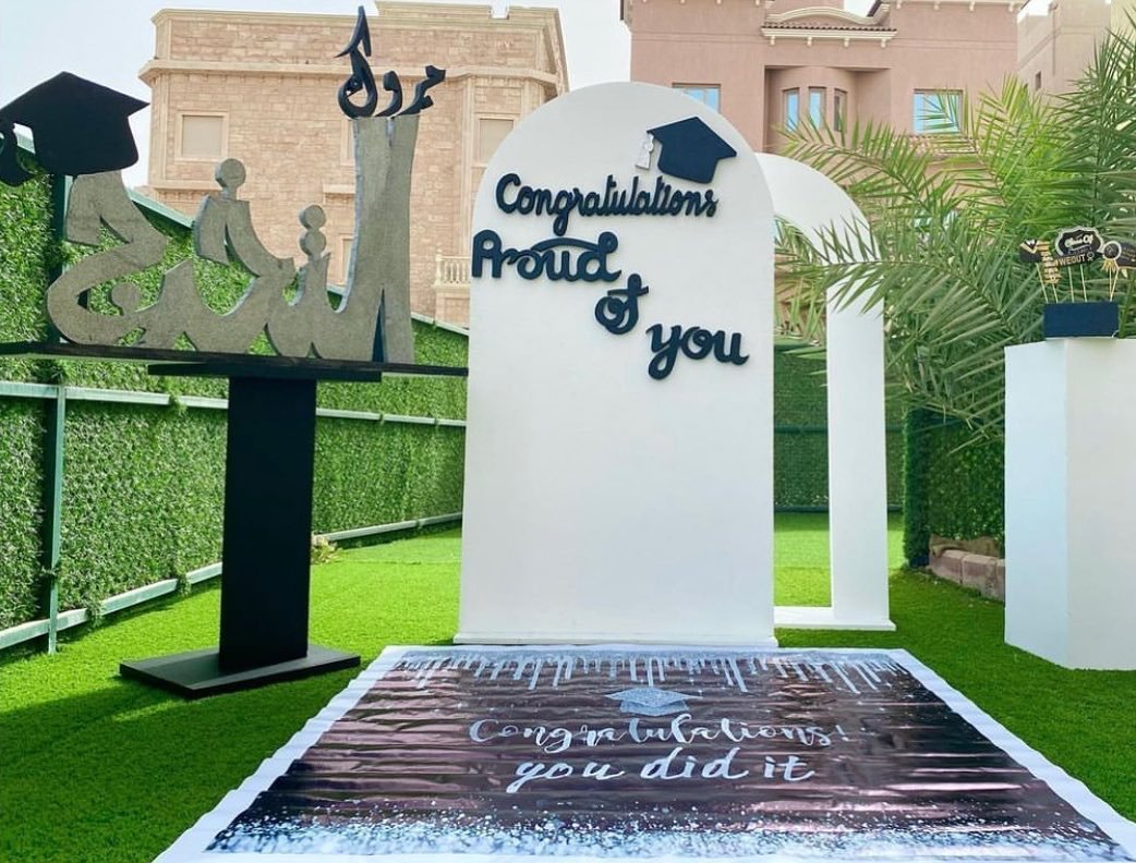 A backyard moment that feels like a warm hug from your biggest supporters. @thedesignballerina’s setup blends architectural arches, sleek cutout lettering, and sweet celebratory energy all under a golden sky. The Arabic script alongside the “Proud of you” wall adds a personal and cultural touch that feels deeply rooted yet fresh.