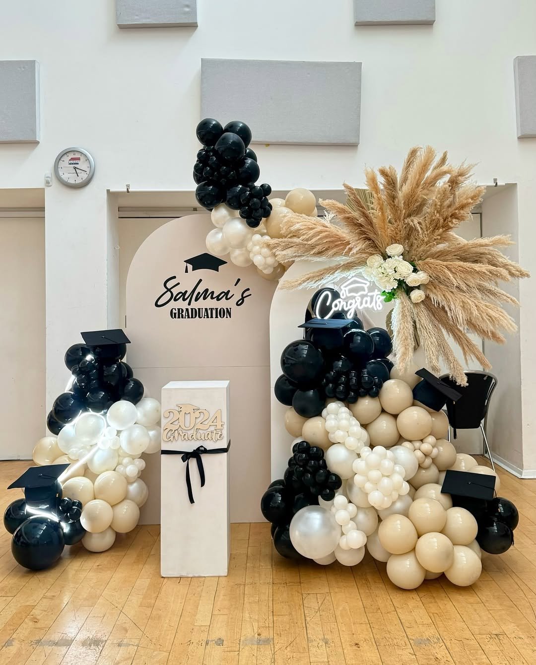 @bloomsandballoonsuk delivers a striking monochrome palette with creamy nudes, blacks, and whites—then ups the ante with oversized pampas plumes and playful grad cap accents. It’s bold, structured, and full of personality.