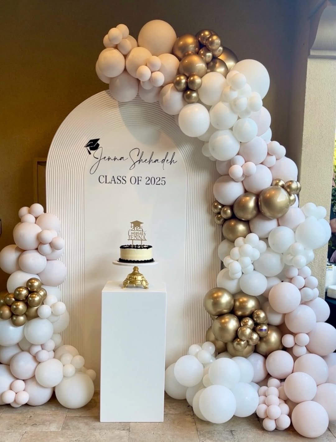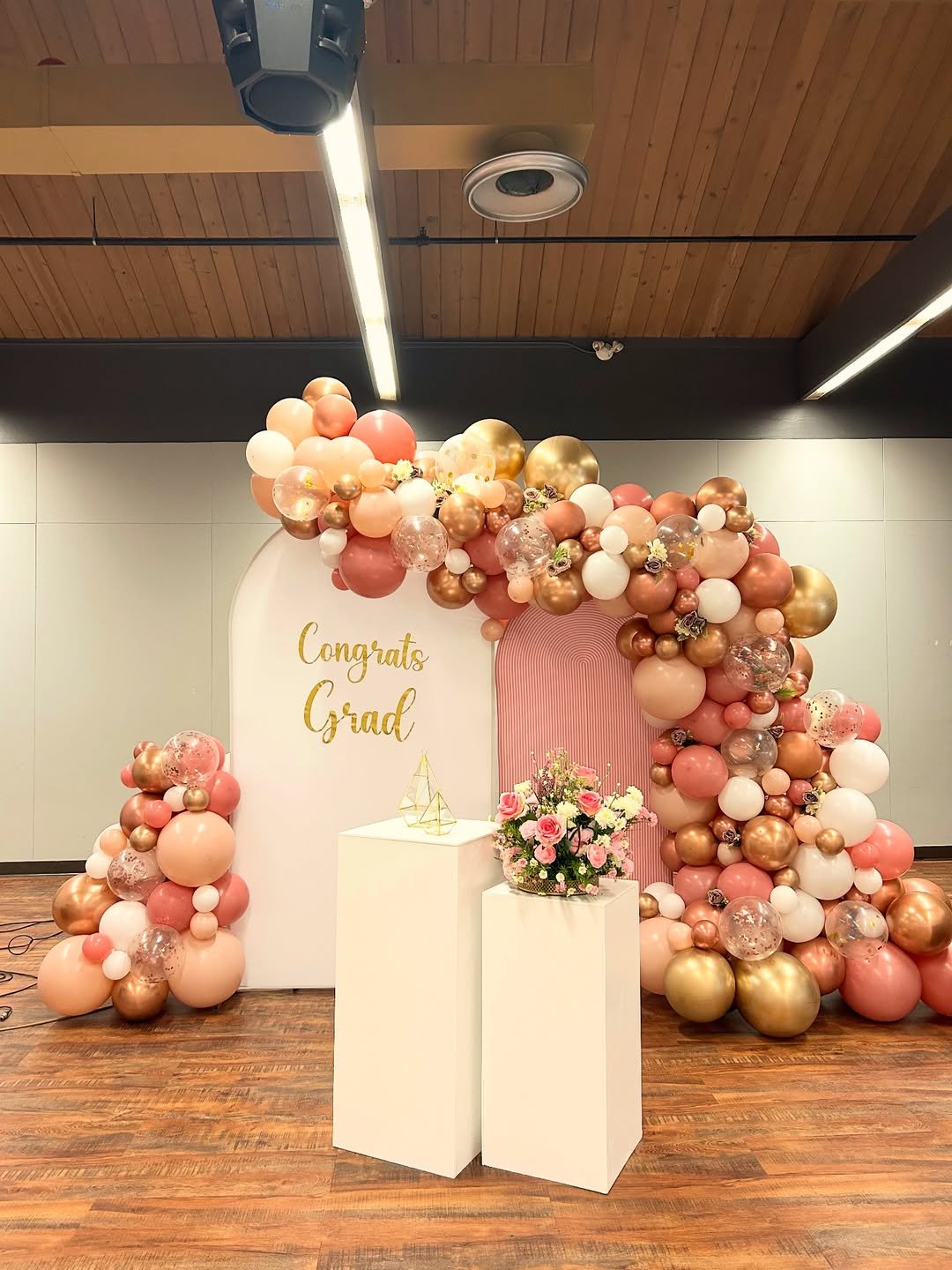 This display feels like a chilled glass of sparkling rosé—effortless, pretty, and a little celebratory. The warm blush and gold tones add just the right amount of luxe, while the mix of sizes (and those clear balloons with gold flecks!) bring in texture and dimension. It’s giving classic grad party with a grown-up, Pinterest-worthy upgrade.