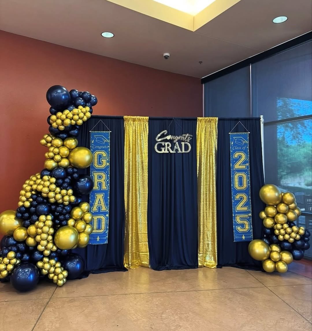 Navy and gold never go out of style—and this backdrop proves why. The draping has a theatrical richness to it, almost like you’re stepping into a regal ballroom. It’s formal without being stuffy, and totally worthy of a high school or college milestone.