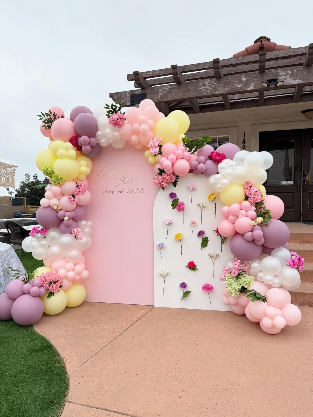 Soft, sunny, and full of charm—this setup feels like a love letter to spring. The pastel balloon garland arches sweetly over a half-pink, half-white backdrop, but what really steals the moment is the delicate flower wall. Real blooms pinned to the board like pressed petals in a diary—each one a little nod to beauty, growth, and celebration.