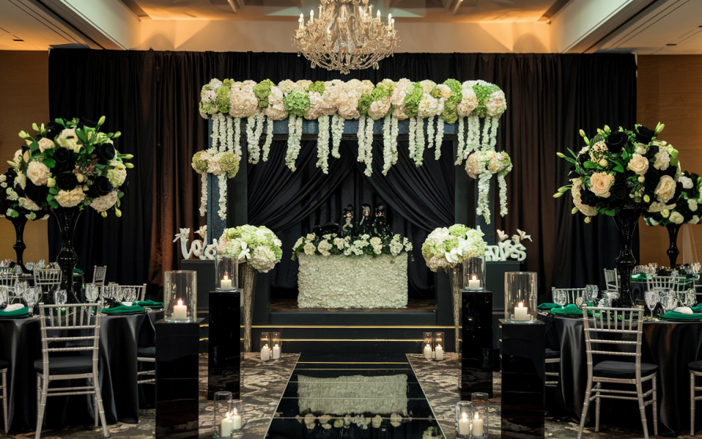 This striking setup features a stunning black-draped altar with an overhead floral canopy made of ivory hydrangeas, cascading orchids, and pops of soft green foliage. The aisle is lined with glossy black pedestals, each holding clear glass hurricane candles that emit a romantic glow. The guest tables are draped in sleek black linens and accented with emerald green napkins for a pop of color, while silver Chiavari chairs provide a polished finish. Centerpieces include tall, black vases overflowing with white roses, black blooms, and lush greenery, creating a dramatic and luxurious look. The grand chandelier overhead adds a touch of classic elegance, illuminating the space with its sparkling crystal details.