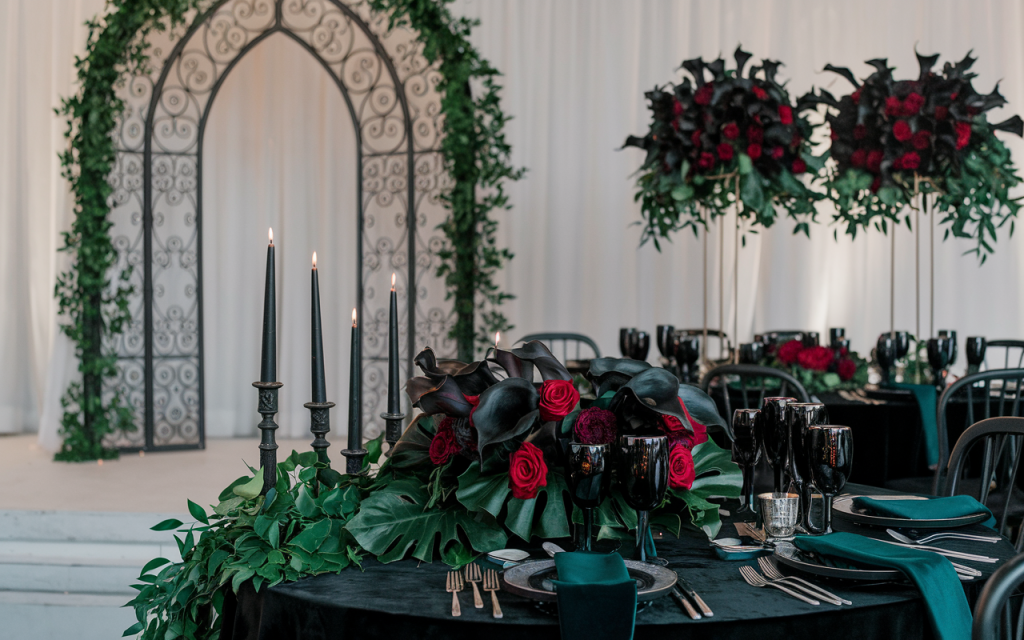 The centerpiece features a stunning display of crimson roses and velvety black calla lilies, nestled among monstera leaves and vibrant greenery for a lush, organic look. The wrought-iron arch, draped in delicate ivy, creates a romantic ceremony backdrop, exuding timeless sophistication. Black taper candles in matte candlesticks add a moody glow, while the tablescape continues the theme with velvet black linens, gold flatware, and deep emerald napkins. Each place setting is adorned with black glassware, and the towering floral arrangements create height and visual drama, drawing the eye upward. This setup perfectly balances gothic allure with refined elegance.