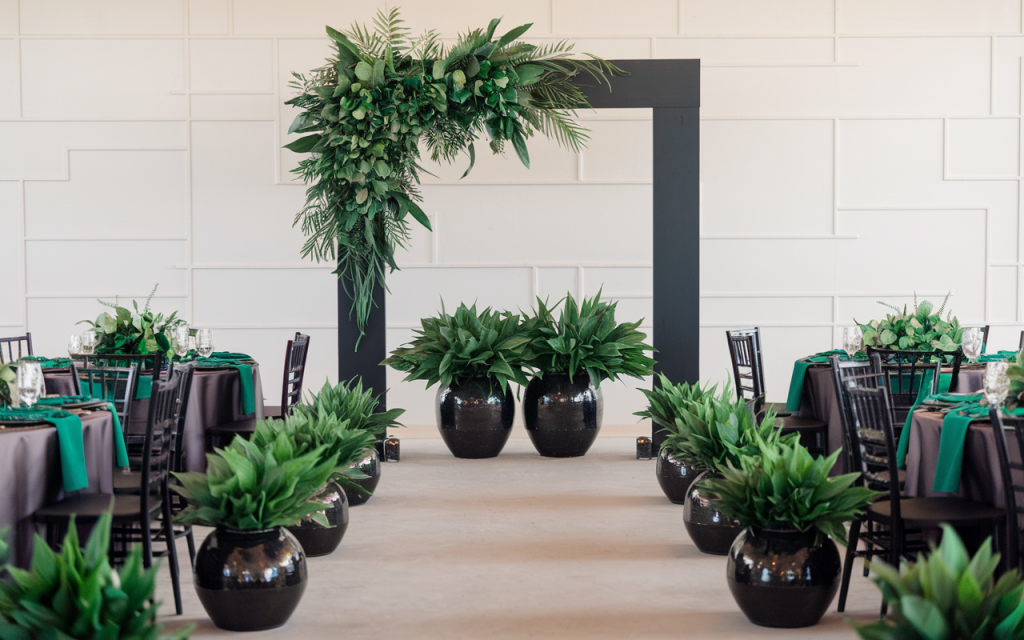 At the heart of this decor is a bold, black square arch, featuring an asymmetrical cascade of rich greenery, including ferns, tropical leaves, and eucalyptus, adding depth and texture. The aisle is lined with glossy black ceramic planters overflowing with vibrant green foliage, creating a lush walkway that feels alive and fresh. Tables are adorned with dark gray linens, black Chiavari chairs, and emerald green napkins, perfectly tying in with the theme. Minimalist centerpieces of fresh greenery in black vases keep the design sleek and modern, while glassware and neutral table settings add a touch of elegance. The simple white geometric backdrop further emphasizes the vivid greens and dark accents, enhancing the clean, contemporary look.