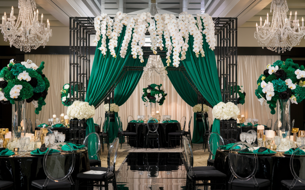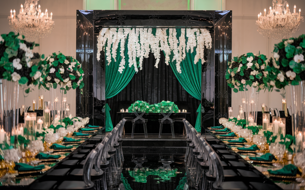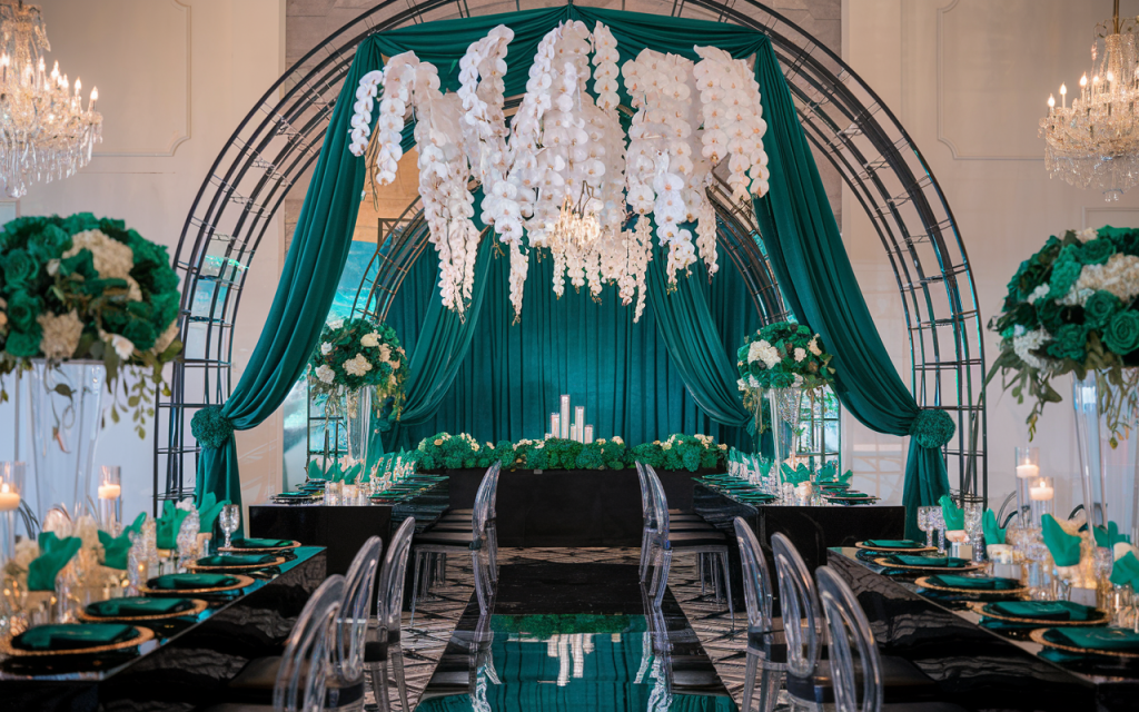The centerpiece of this venue is the dramatic emerald drapery, cascading gracefully across a metallic arch structure, framing a stunning arrangement of lush greenery and white floral accents. A canopy of cascading white orchids, illuminated by an intricate chandelier, adds a touch of ethereal beauty to the scene. The tablescape boasts sleek black surfaces, complemented by emerald napkins, crystal-clear ghost chairs, and gold charger plates for a perfect balance of modern sophistication and regal charm. Towering floral arrangements with green and white hydrangeas sit atop tall glass vases, adding height and drama to the setting. The reflective black aisle amplifies the grandeur, while the soft glow of candles creates an ambiance of romance and intimacy.