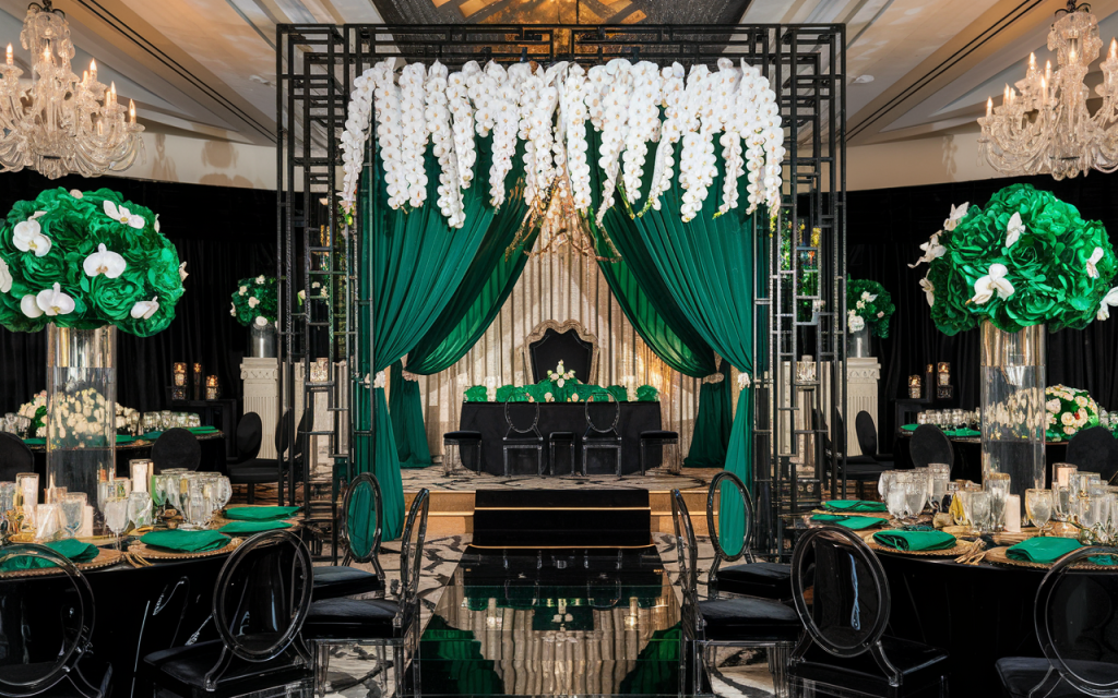 The focal point of the setup is the grand stage draped in opulent emerald green curtains, accented by a stunning canopy of cascading white orchids, creating a dramatic yet elegant backdrop. The elevated stage features a black and gold throne-style chair and a matching table adorned with white floral arrangements for a royal touch. Surrounding the stage, tall centerpieces of vibrant green roses interspersed with delicate white orchids add height and richness to the tablescapes. Each dining table is dressed with glossy black linens, emerald napkins, and gold charger plates, creating a perfect blend of boldness and refinement. The reflective black aisle leading up to the stage enhances the grandeur, while crystal chandeliers cast a warm glow, elevating the ambiance to pure luxury.
