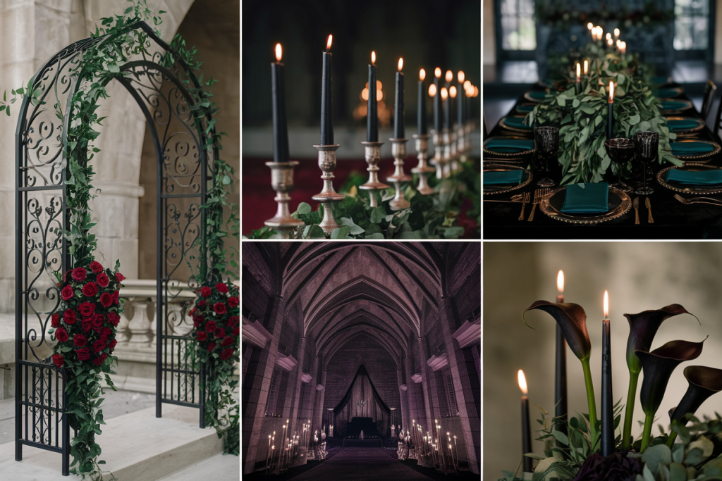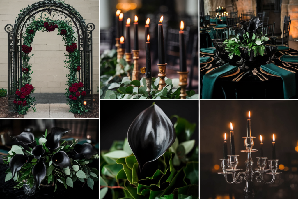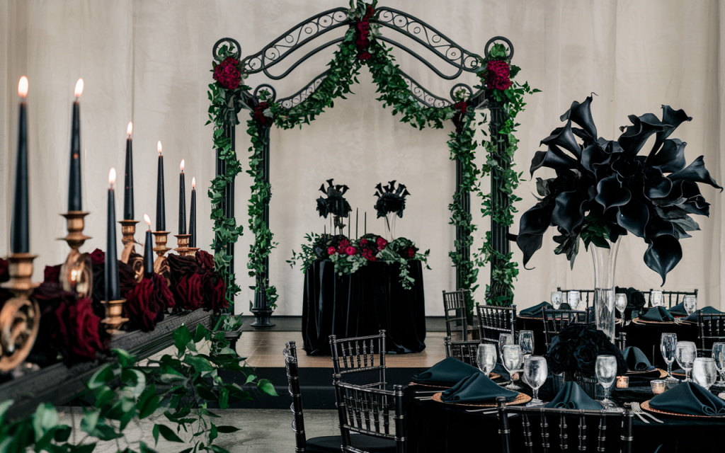 This stunning backdrop features a wrought-iron arch entwined with cascading ivy and crimson roses, framing the ceremony space with a regal, gothic touch. Flanked by sleek black candlesticks holding flickering black taper candles, the decor creates a romantic ambiance that is both bold and enchanting. The tablescape continues the theme with towering floral arrangements of midnight-black calla lilies and subtle greenery, complementing the dark, moody palette. Textured black table linens paired with deep emerald napkins, gold charger plates, and crystal-clear glassware add a layer of refinement to the design. The space is grounded by carefully arranged details, including velvet accents and warm golden candleholders, making it a feast for the senses.
