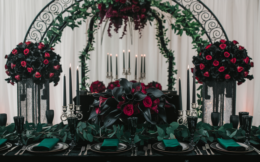 The centerpiece showcases an opulent arrangement of deep crimson roses and striking black calla lilies, perfectly offset by the dark greenery cascading across the table. Black taper candles in silver candelabras add a touch of dramatic romance, while the ornate metal arch, draped with ivy and floral accents, creates a stunning backdrop that frames the entire scene. Each place setting features sleek black plates, complemented by emerald green napkins for a subtle pop of contrast. The cohesive color palette of black, red, and green exudes an air of mystery and elegance, making this setup ideal for couples seeking a bold and distinctive wedding aesthetic.