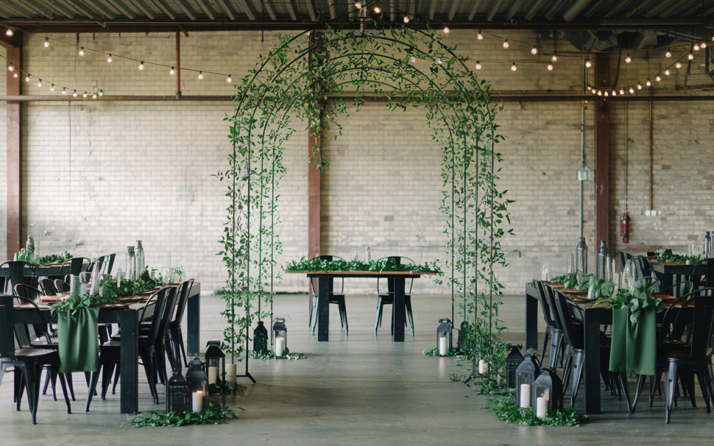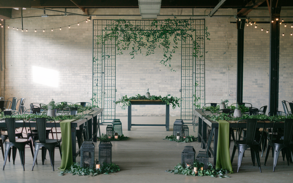 The ceremony is framed by a striking metal arch adorned with cascading greenery, creating an organic focal point in the industrial space. Black lanterns with flickering candles line the aisle, casting a warm glow on the venue’s exposed brick walls. Reception tables are dressed in rustic wooden planks, highlighted by lush greenery runners and minimalistic plant arrangements. The black metal chairs provide a bold contrast to the greenery, while the soft olive green fabric runners add a pop of color, tying the space together. Overhead, string lights twinkle, casting a magical, cozy ambiance across the industrial space.