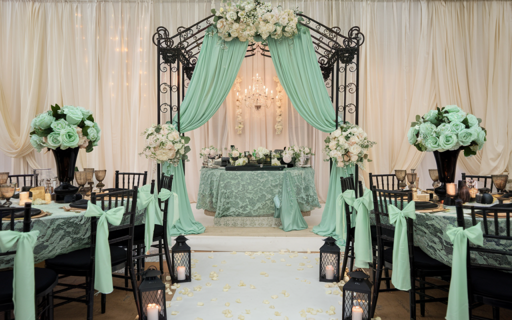 At the heart of this setup is the stunning emerald-draped stage framed by a sleek black metallic arch adorned with lush greenery and delicate white flowers. Overhead, a mesmerizing chandelier is surrounded by cascading white orchids, offering a dramatic yet ethereal focal point that elevates the entire venue. The aisle, designed with a reflective black surface, amplifies the grandeur of the setting, drawing all eyes to the altar. The tables lining the aisle are decorated with rich emerald napkins, crystal-clear glassware, and gold-accented charger plates, exuding sophistication. Towering floral arrangements, featuring green hydrangeas and creamy white roses, add layers of depth and texture. The soft glow of candlelight scattered throughout the venue further enhances the romantic ambiance.