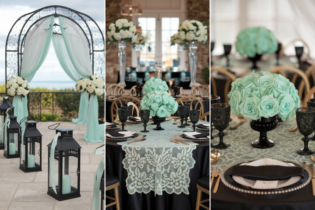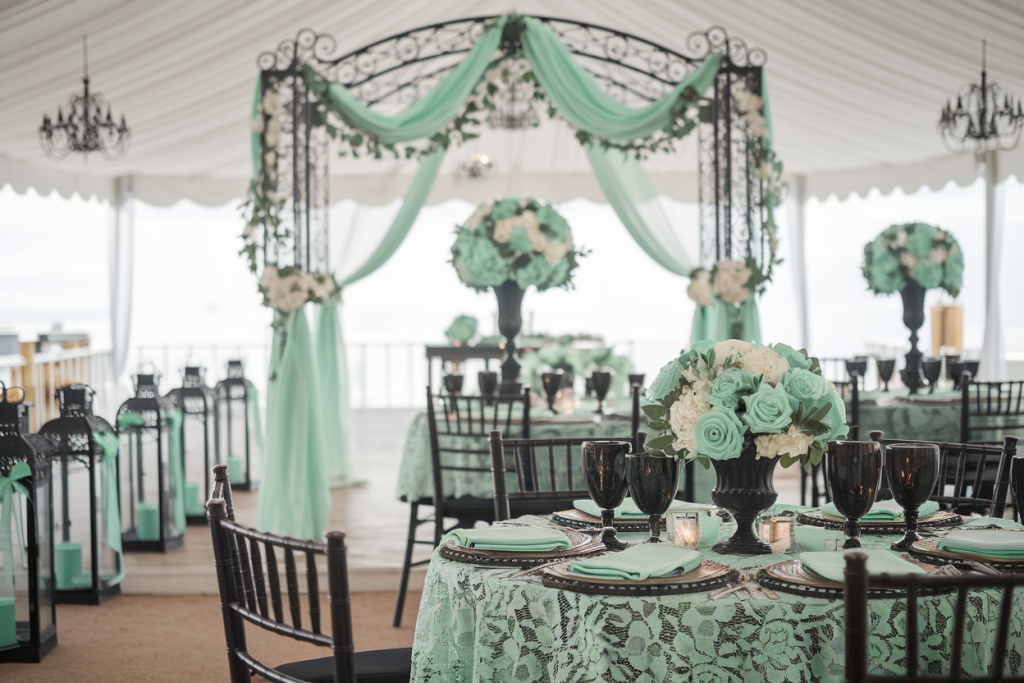 Each table centerpiece features tall black pedestal vases filled with mint roses and white hydrangeas. These arrangements, with their striking color contrast, bring height and visual interest to the tablescape, tying together the black and mint theme seamlessly.