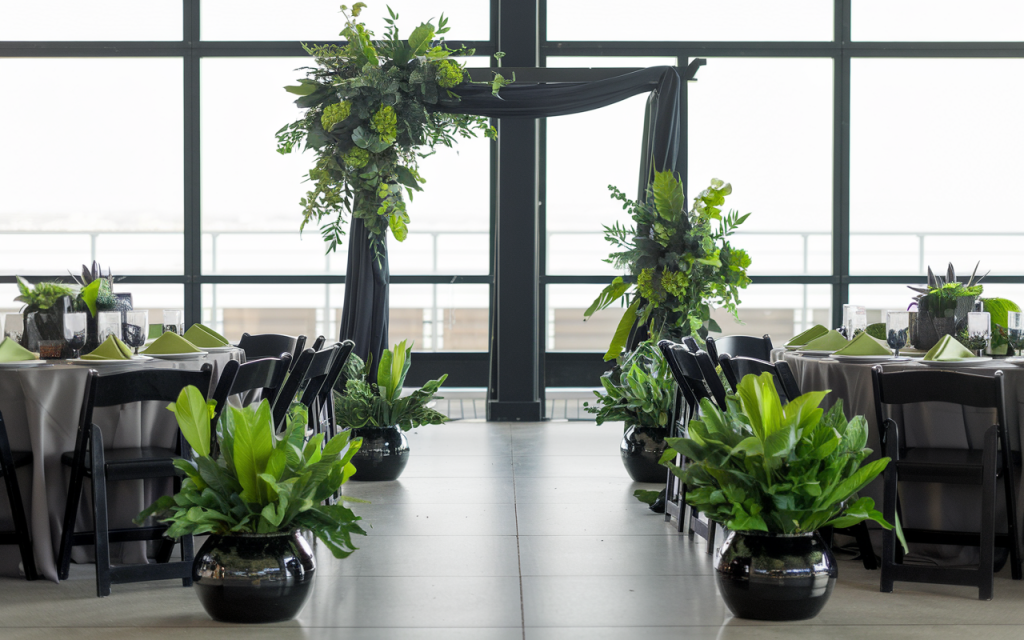 The centerpiece of this setup is the minimalist black ceremony arch draped with soft black fabric, beautifully accented with cascading greenery, including vibrant ferns, tropical leaves, and bright green hydrangeas. Flanking the aisle are glossy black planters filled with vibrant, leafy plants that lead the way to the altar, adding life and dimension to the scene. Guest tables are dressed in smooth gray tablecloths with bold black chairs, accompanied by matching black vases and green napkins for a cohesive, earthy color palette. The design perfectly balances contemporary minimalism with organic beauty, creating an ambiance that feels both grounded and elevated.