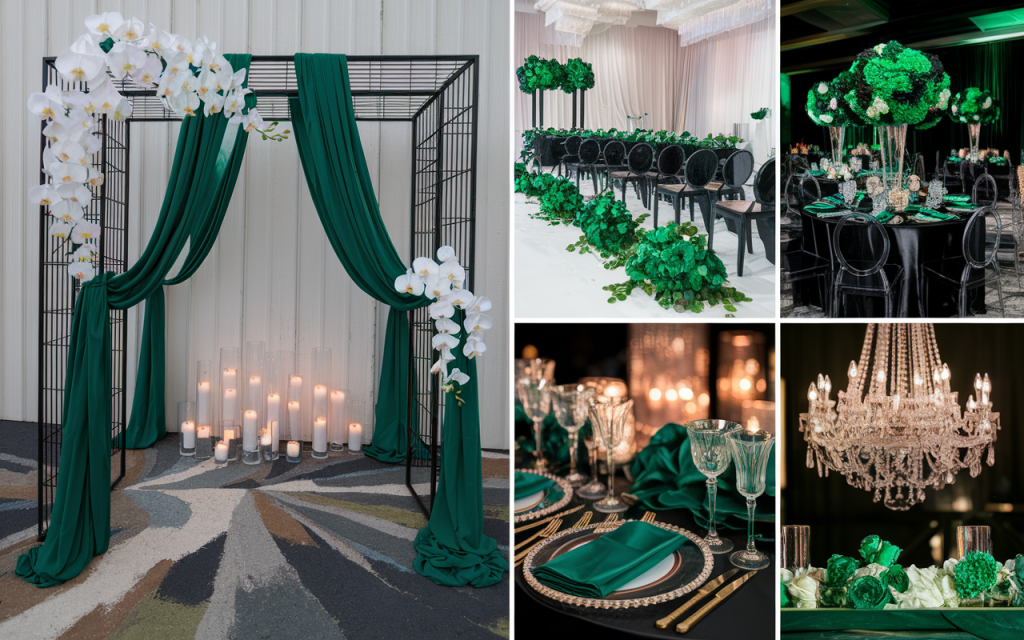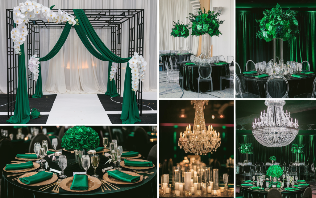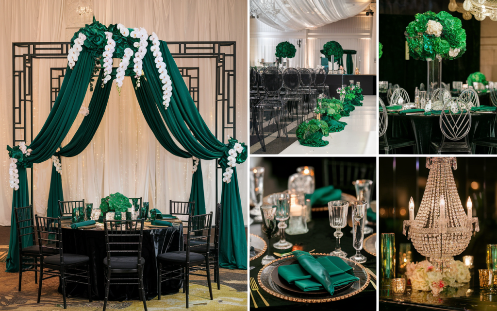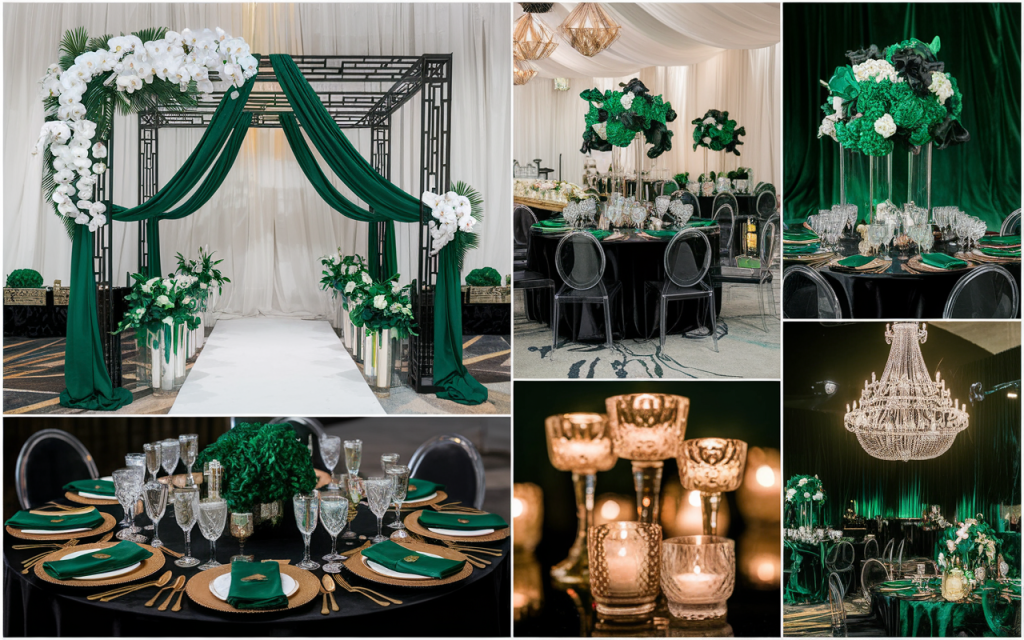 This design is ideal for extravagant ballroom weddings, luxury receptions, or formal galas. Perfect for couples who love bold and refined aesthetics, the emerald and white color scheme makes it a standout choice for elegant indoor venues. Whether hosting an intimate ceremony or a grand celebration, this decor promises to leave a lasting impression.