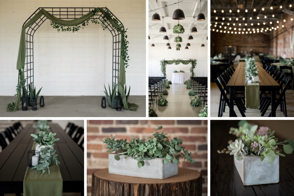 This style is perfect for couples who love a modern, eco-conscious design with a touch of rustic charm. It’s ideal for warehouse venues, lofts, or other urban settings that allow the architectural features to shine. This setup is great for intimate weddings or unique celebrations that highlight both natural beauty and industrial elegance.