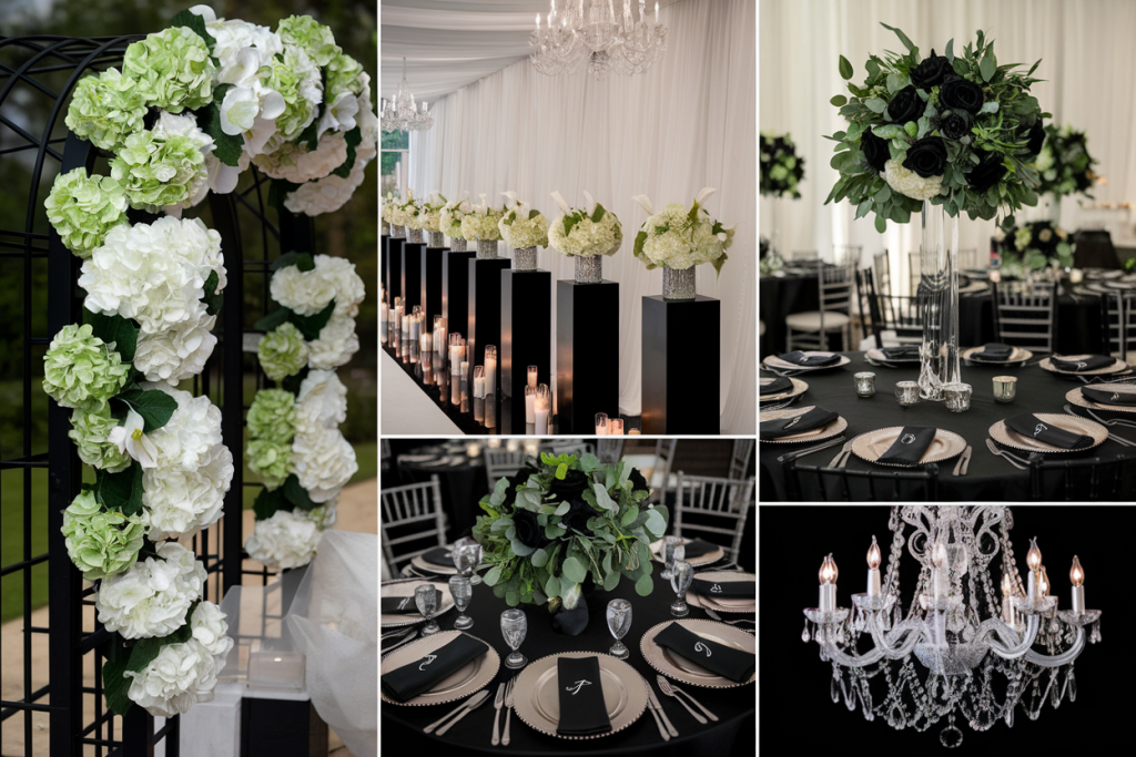 Lower centerpieces feature rich greenery with black roses and white accents, offering a more intimate alternative to the tall floral displays. These arrangements are placed in black ceramic vases, tying seamlessly into the overall design.