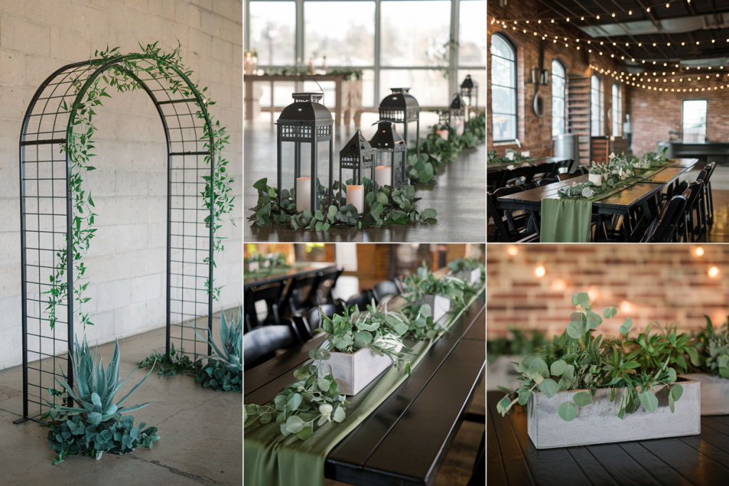 Eucalyptus garlands run the length of the tables, creating a lush, organic feel. Combined with dark wood or black metal furniture, the greenery provides a striking contrast while softening the industrial edges of the space.