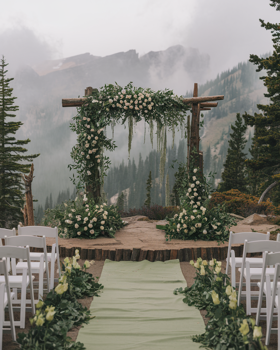 Perched high in the misty mountains, this ceremony setup feels like something out of an elven fairytale — minus the pointy ears, plus chic natural elegance. The rustic wood arch wrapped in trailing greenery and soft white blooms melts perfectly into the wild, fog-laced landscape. And can we talk about the petal-soft green runner? It’s giving enchanted forest runway, in the best way possible.